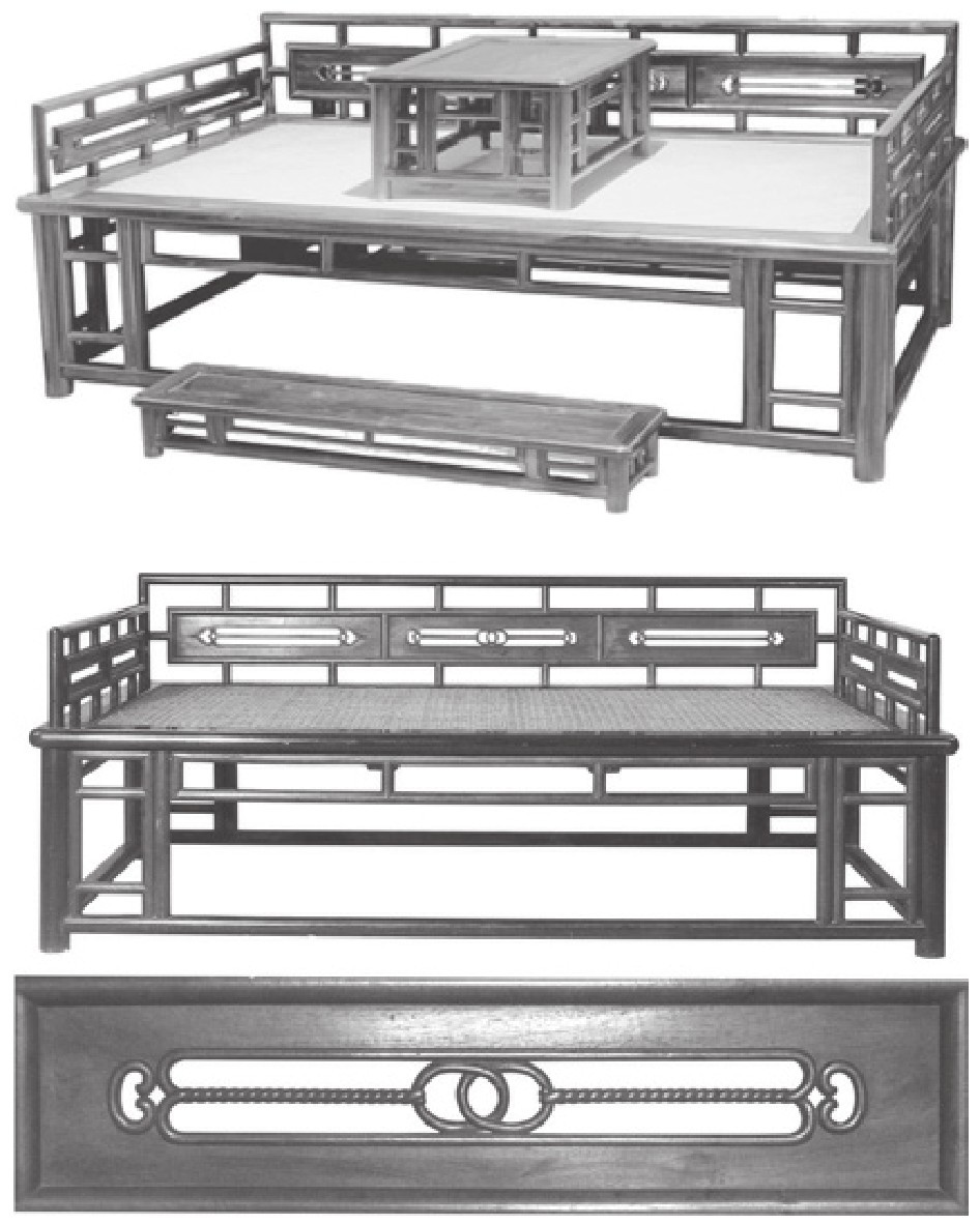架子床为床身上架置四柱、四杆的床。有的在两端和背面设有三面栏杆,有的迎面安置门罩。式样颇多,结构精巧,装饰华美。装饰多以历史故事、民间传说、花鸟山水等为题材,含和谐、平安、吉祥、多福、多子等寓意。风格或古朴大方,或堂皇富丽(图5-23)。