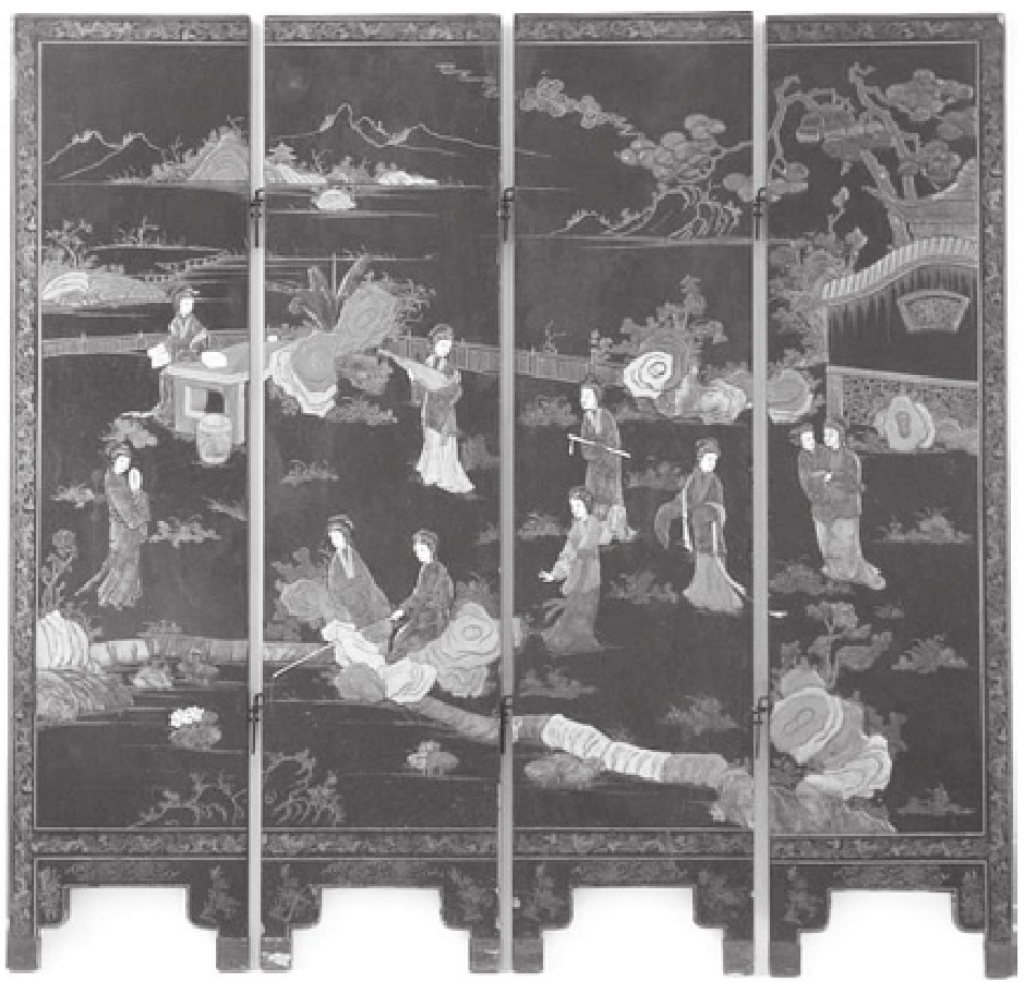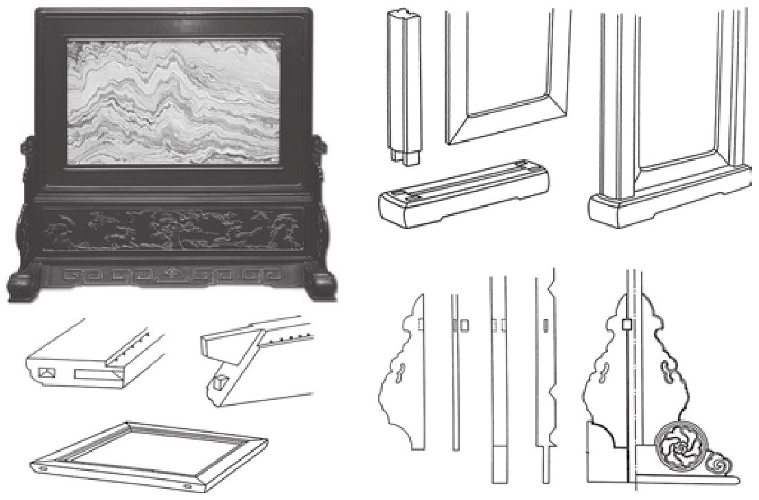 屏风是挡风和遮蔽视线的家具,还可起到分隔空间的作用,分为可折与不可折两类。有单扇,也有两扇、三扇以至十二扇等。明代的木制屏风,有的在屏身裱糊锦帛或纸,其上绘画或书法;有的镶嵌各种石材,也有的镶嵌木雕板,显得雅致灵秀(图5-28)。
