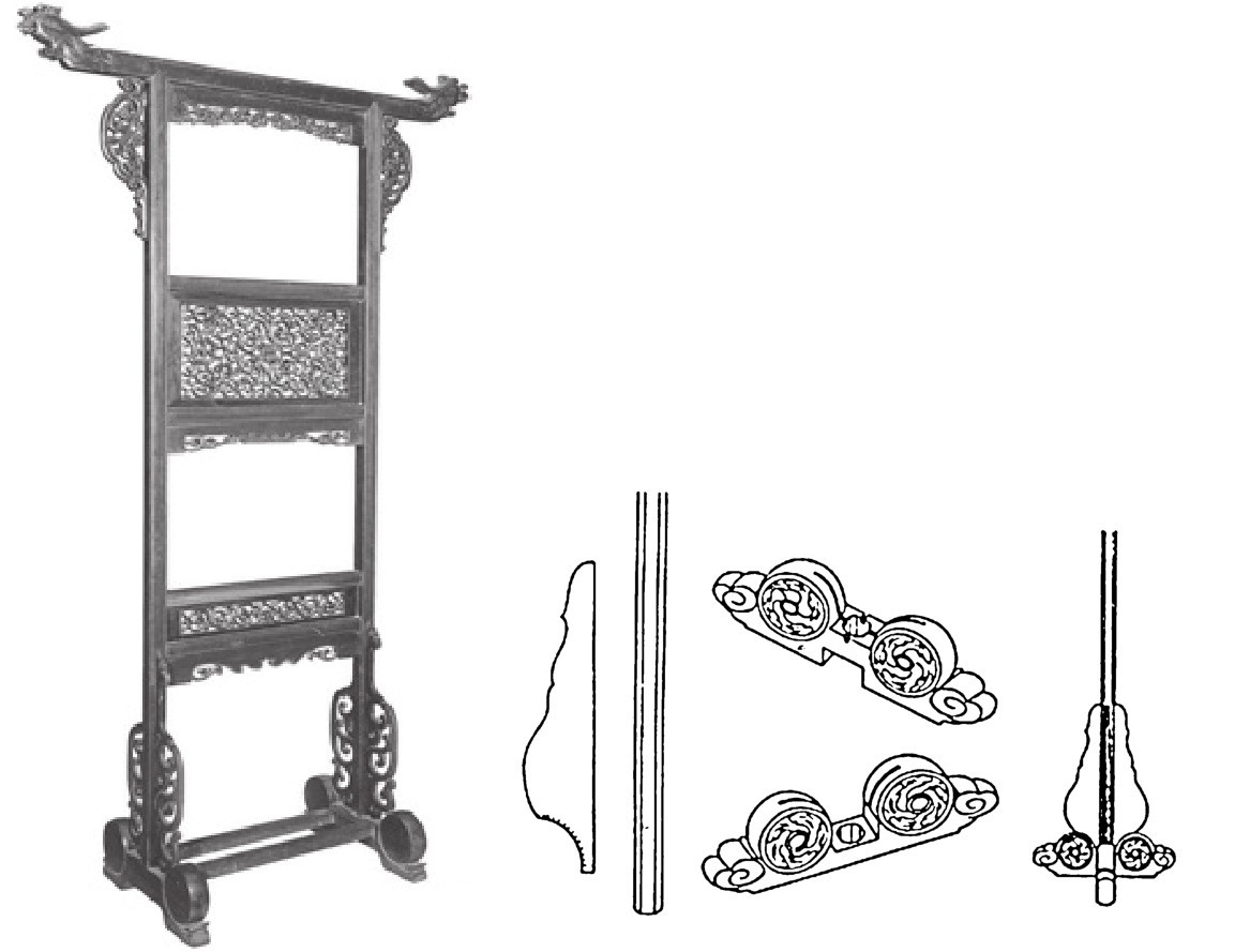 衣架下部为墩式足,两端立柱,以站牙前后挟持稳固墩足与立柱。搭脑两端出头,端头一般以圆雕为饰,中部大多有雕饰精美的花板,如透雕“卍”字、绦环板等,图案雕刻整齐、造型优美(图5-30)。