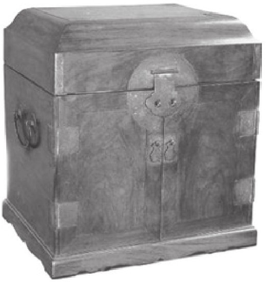 箱的种类很多,有存放衣物的衣箱,有内藏多层抽屉的药箱,还有小巧玲珑的官皮箱。以黄花梨木镶铜饰件的箱子最为讲究(图5-31)。