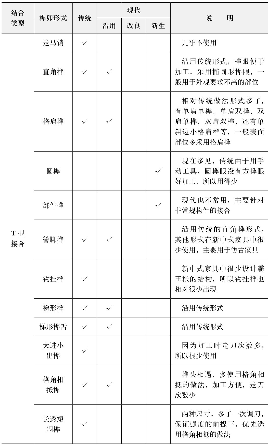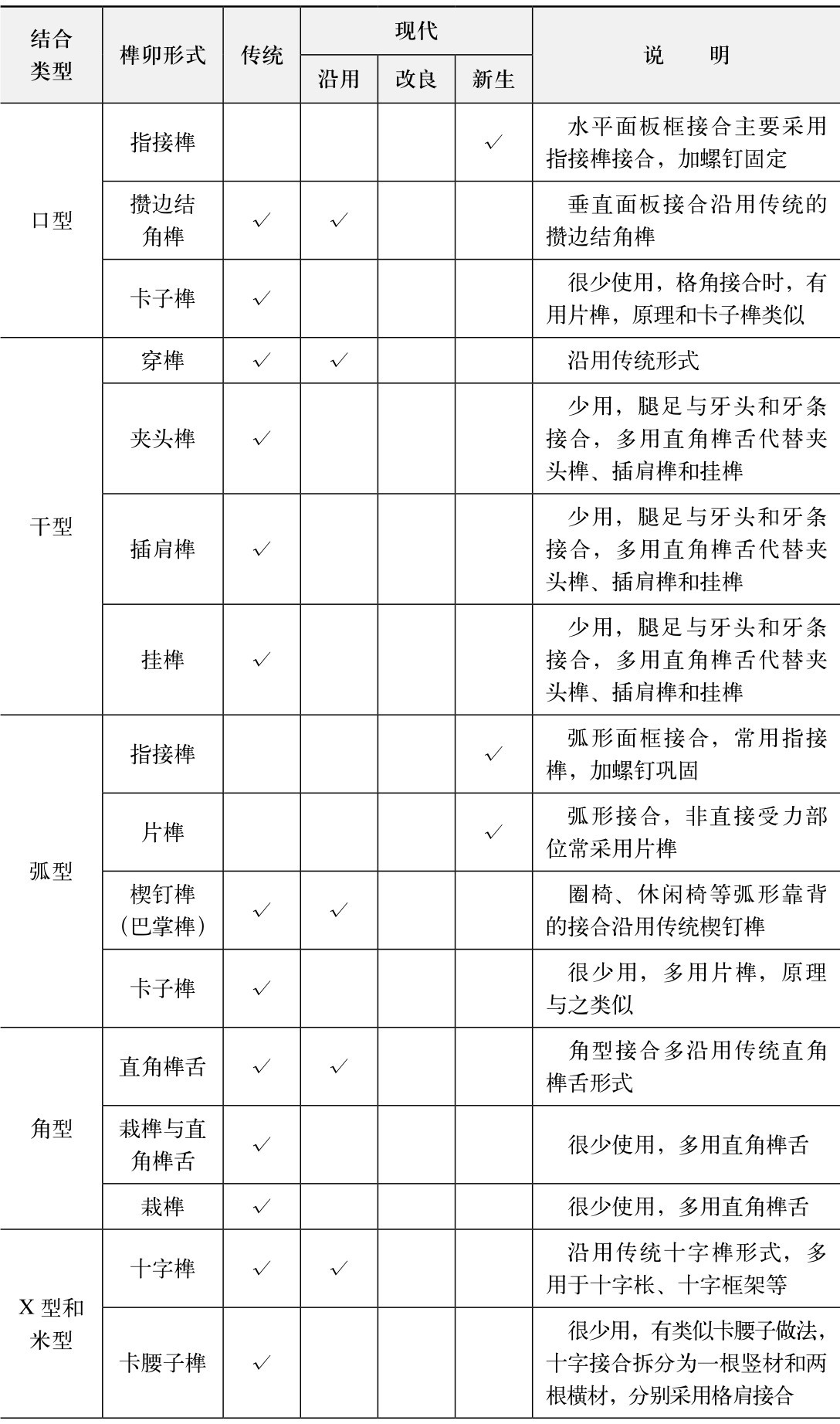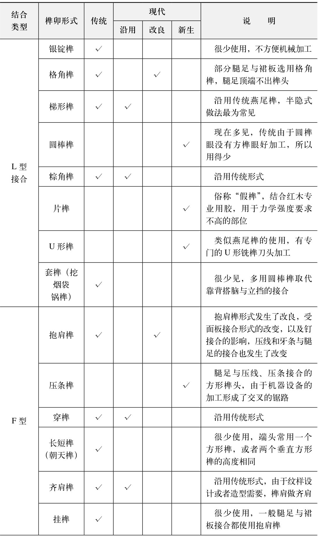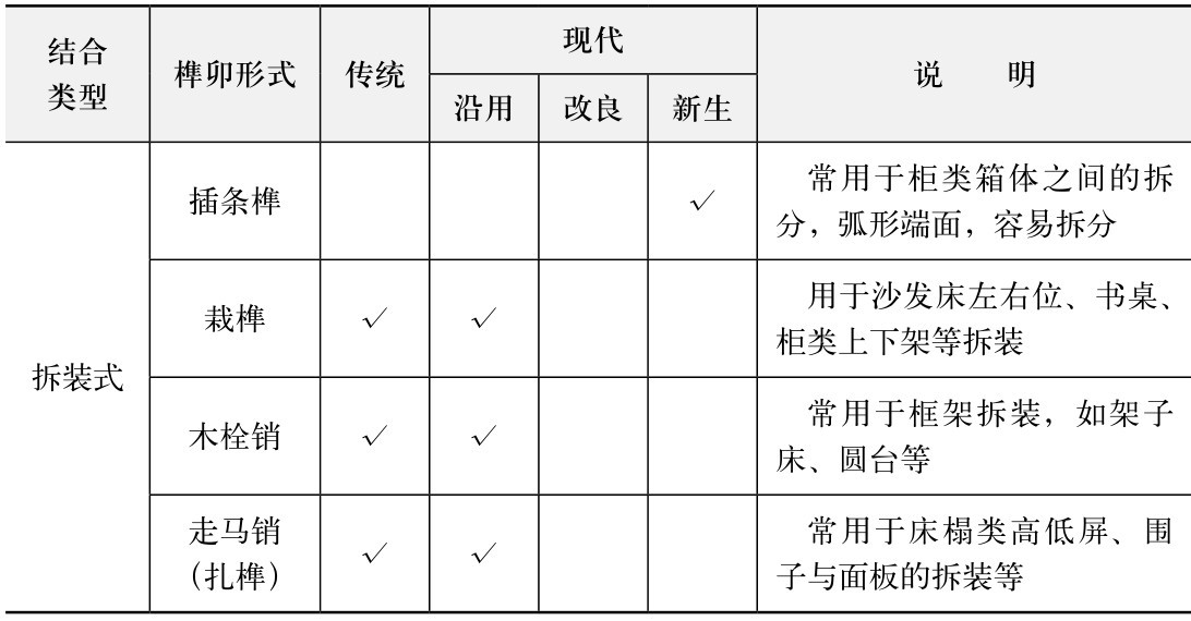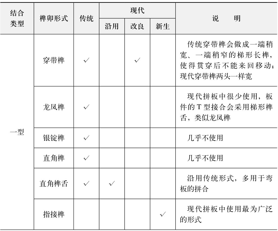 从上表可见,不同接合类型的传统榫卯形式共41种,现代形式共33种,其中沿用18种、改良4种、新生11种。