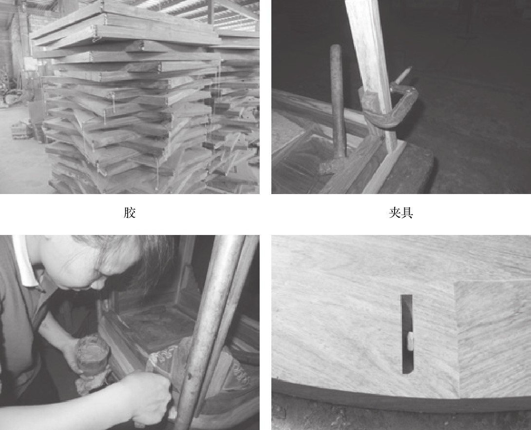 现代生产中,大量使用聚氨酯胶和夹具固定,对尺寸误差导致的缺陷等问题可以用木糠粉和腻子灰修补,这些辅助材料大大降低了对榫卯配合尺寸紧密度的要求(图6-2)。同时钉接合和仿榫五金件也成为红木家具工业化生产中不可缺少的结构形式。