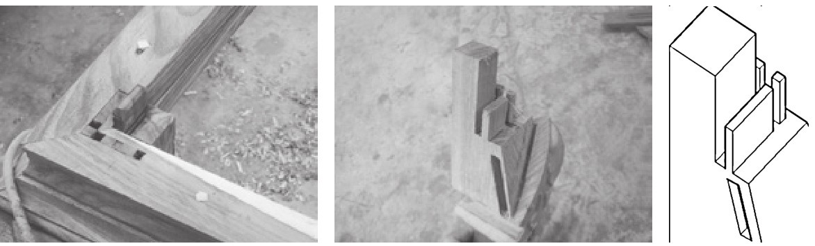 (4)少用的榫卯形式:有龙凤榫、银锭榫、钩挂榫、大进小出榫、套榫、长短榫、挂榫、卡子榫、夹头榫、插肩榫、卡腰子榫等。