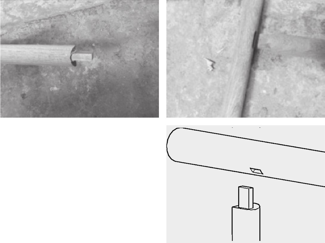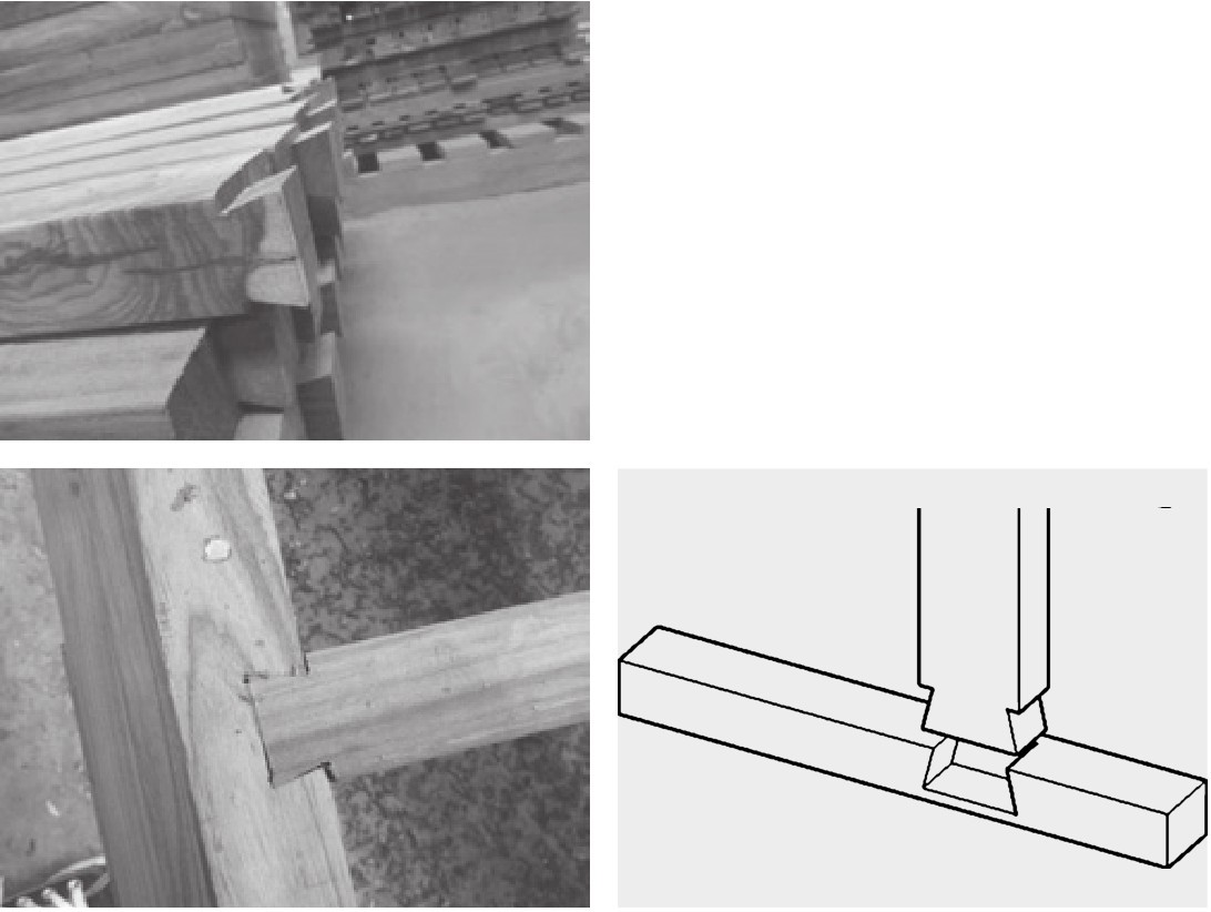 (2)飘肩榫。多用于圆形构件T型接合,横材的肩膀要裹住竖材的外皮,榫肩需要做成弧面。如图6-7所示。
