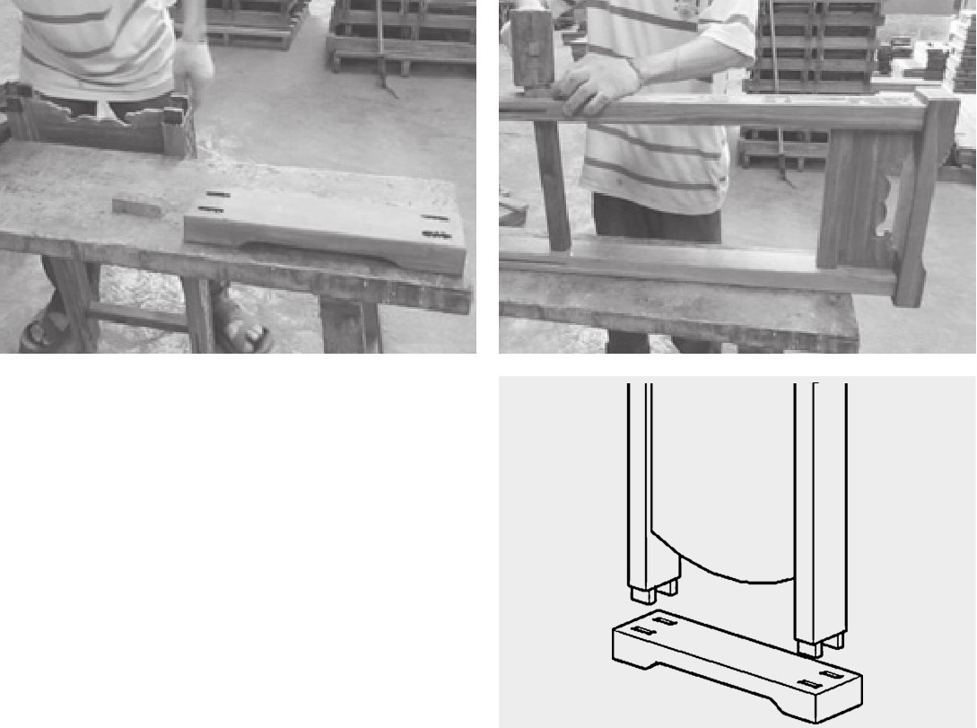 (5)管脚榫。腿足与下部构件,比如腿足与托泥的接合、立柱与底座的接合还是用管脚榫,腿足下部出榫头,托泥和底座钻榫眼。如图6-10所示。