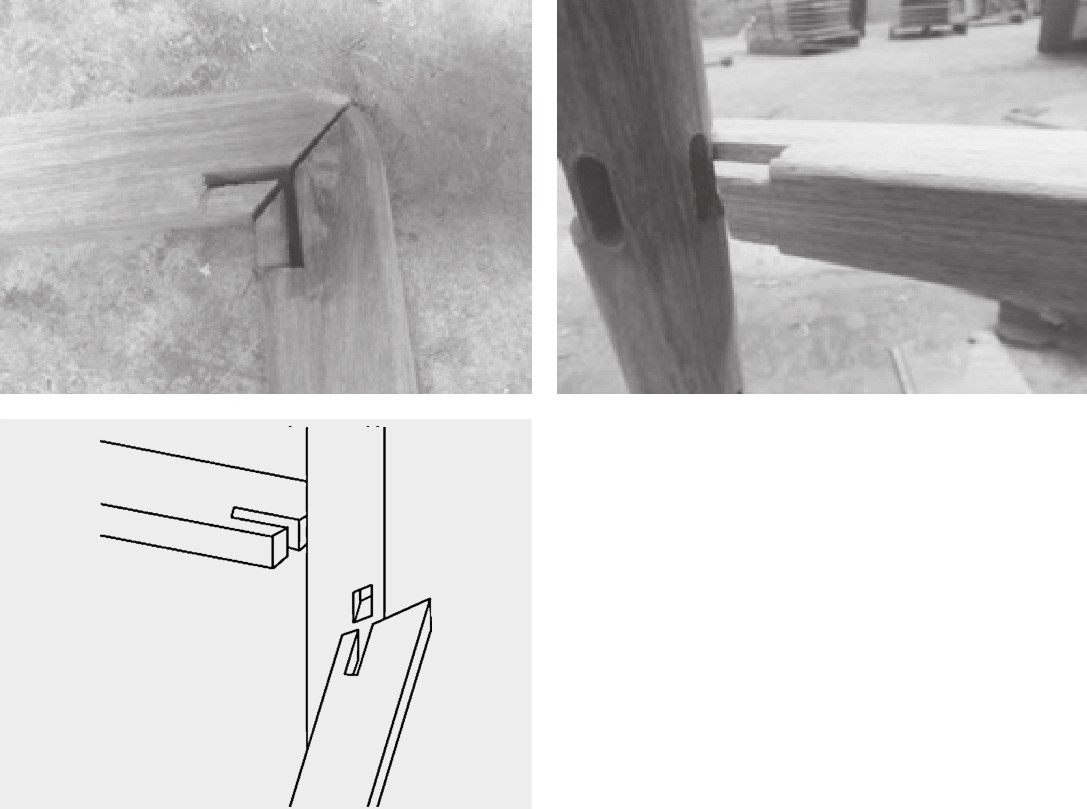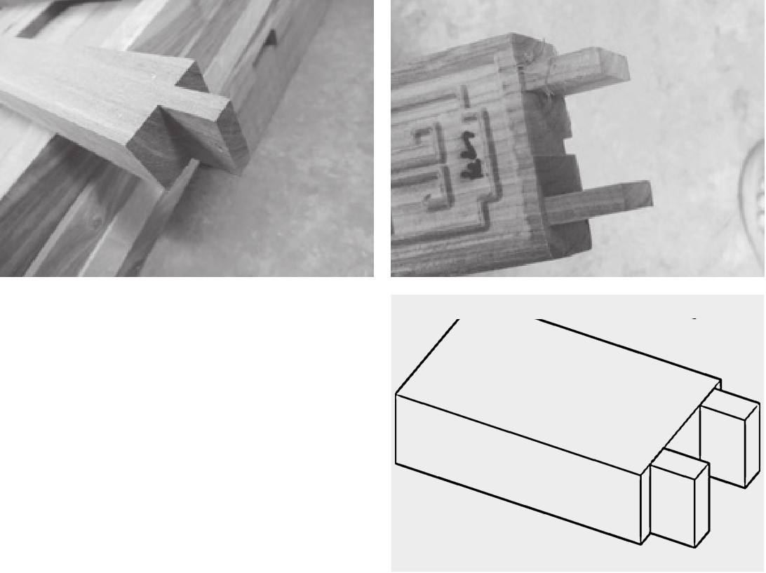 (7)部件榫。部件榫用于接合强度要求高,接合部件是不规则形,断面不方便开榫头,接合时部件自身一部分与另一部件的槽口配合。一般榫槽宽度1.2~1.8 cm,深度1.5~2 cm。如图6-13所示。