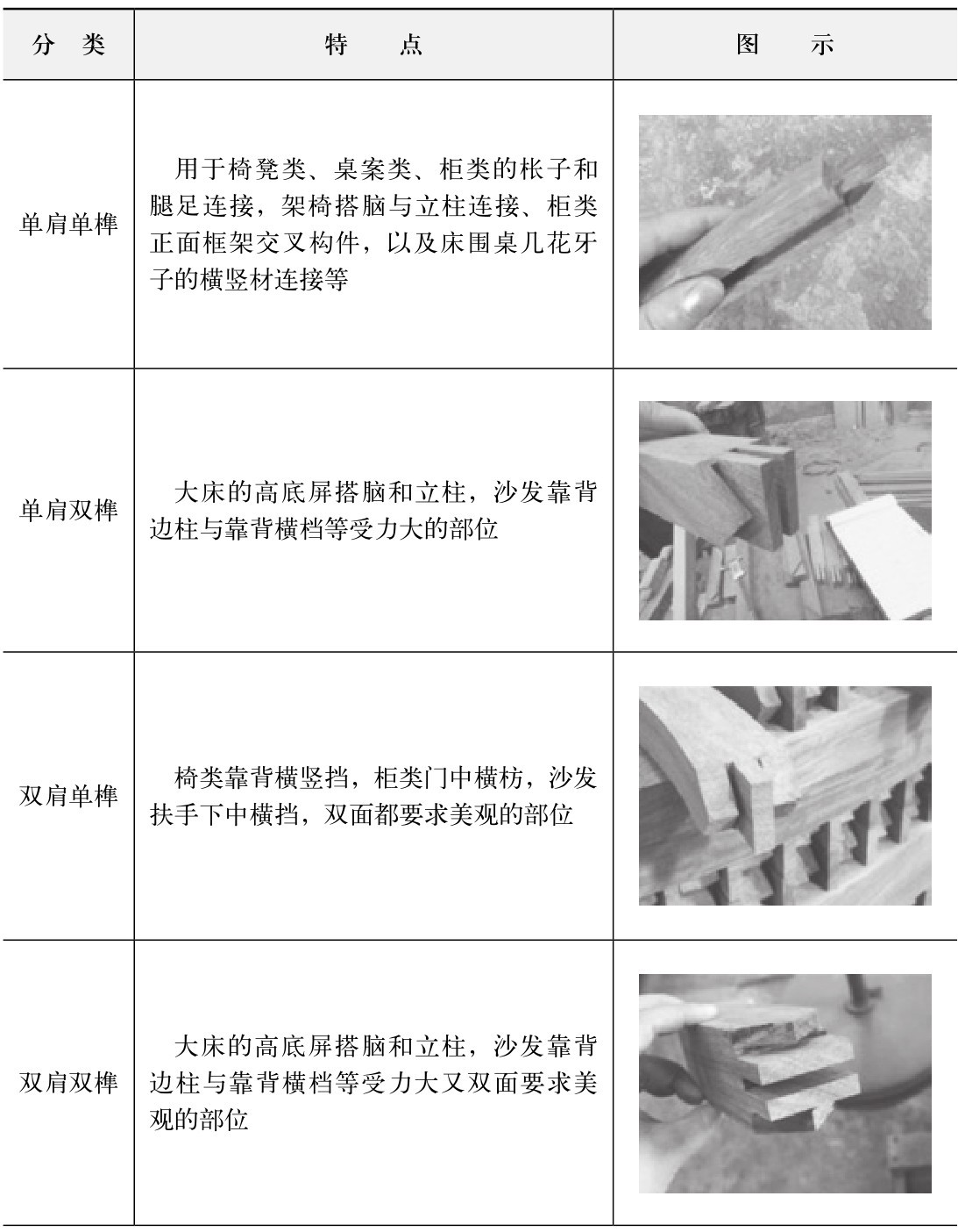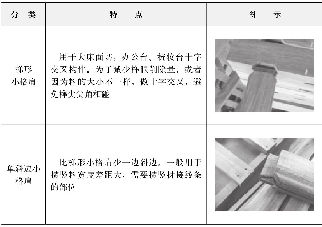 (1)格肩榫。家具表面的T型接合一般都会采用格肩处理,具体格肩榫的分类、特点和图示如表6-3所示。