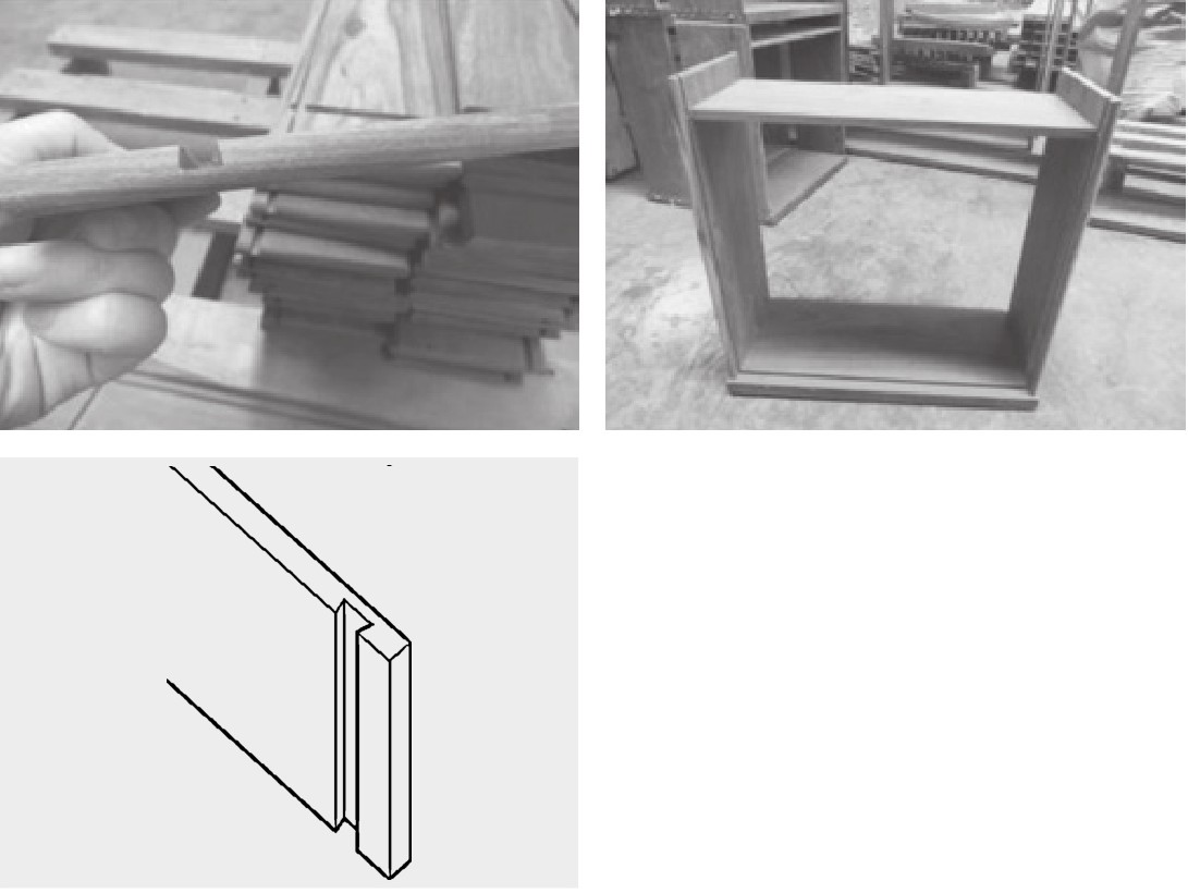 (6)梯形榫和梯形榫舌。梯形榫用于方材之间的接合,比如大床床架与拉档。因为榫头截面为梯形,接合后长度方向扣牢,无法移动,如图6-11所示。梯形榫舌一般用于板与板之间T接合,常用于抽屉背板与侧板、储物内格档等。如图6-12所示。