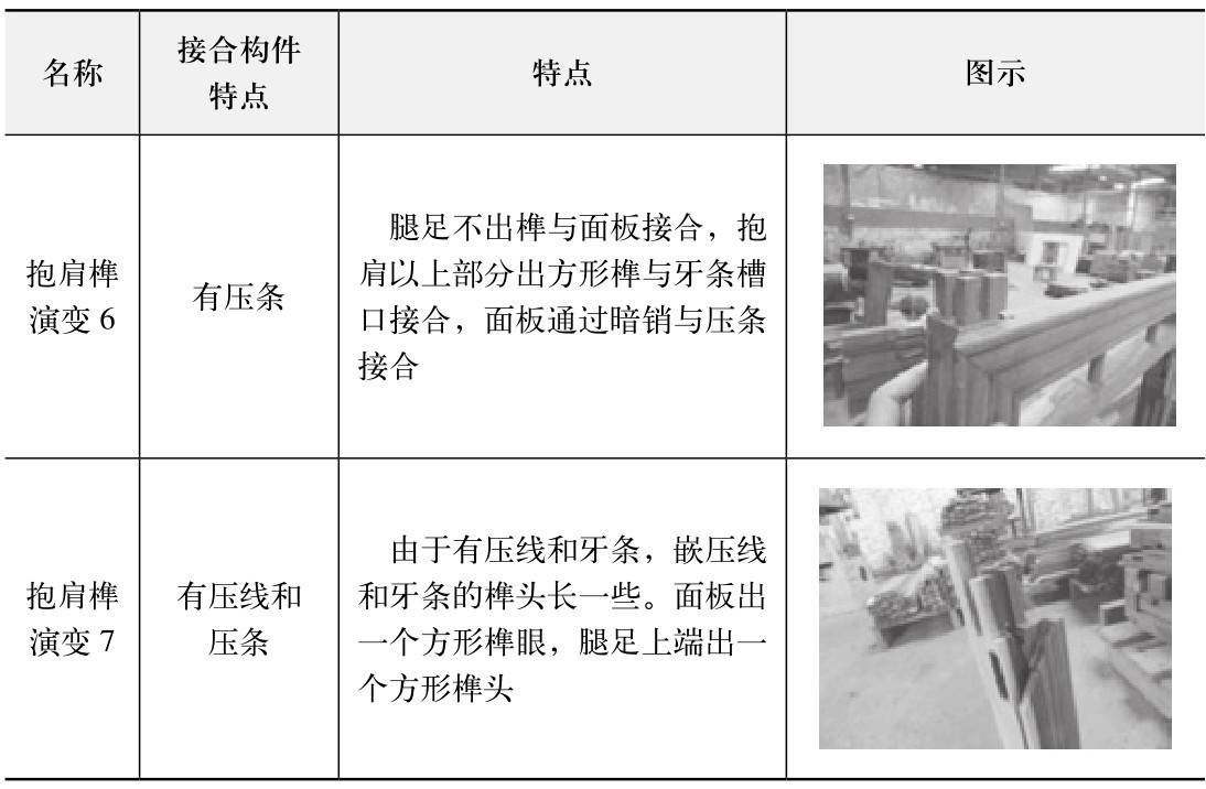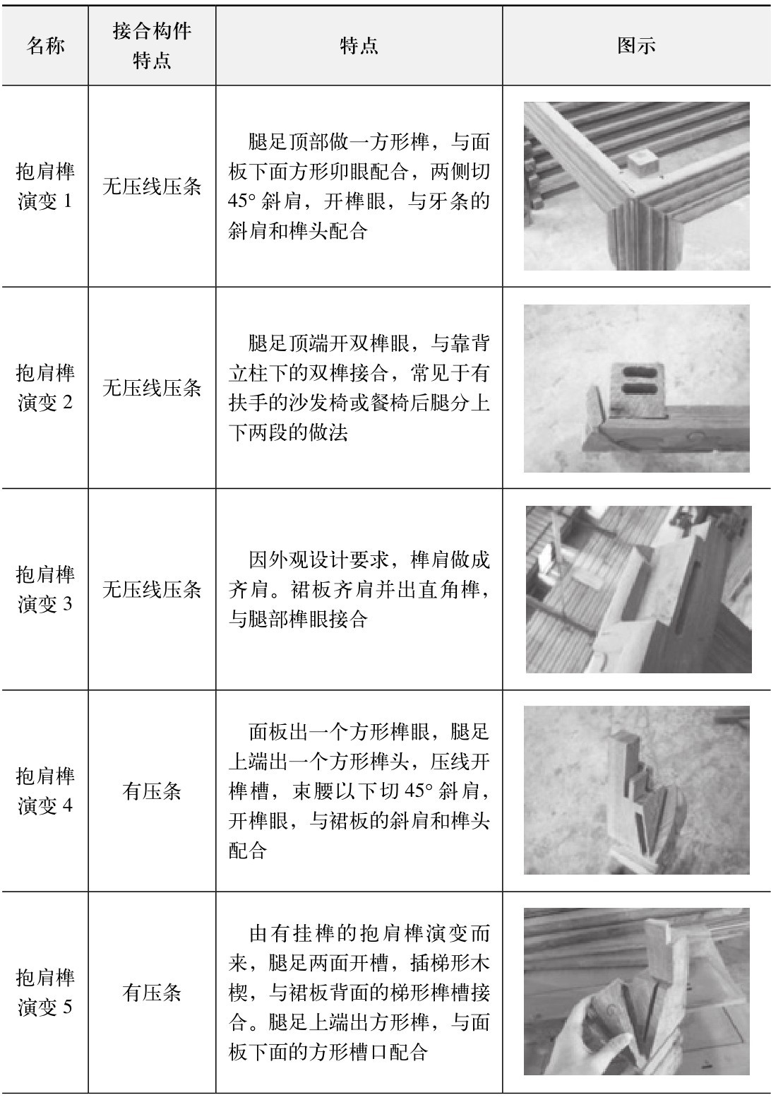 F型接合指腿足与上部构件的接合以及格角穿榫接合。传统家具中的抱肩榫、齐肩榫以及挂榫在现代生产中都发生了一些演变,具体腿足与上部构件接合的榫卯分类、特点和图示如表6-4所示。