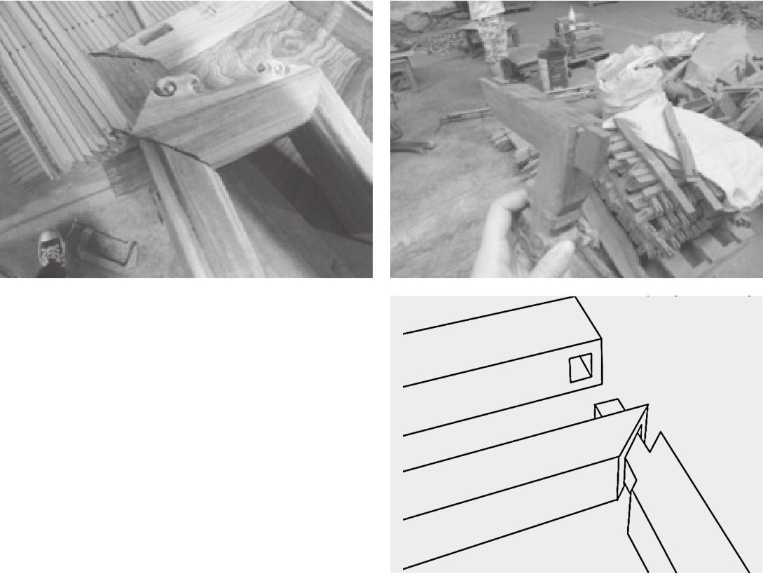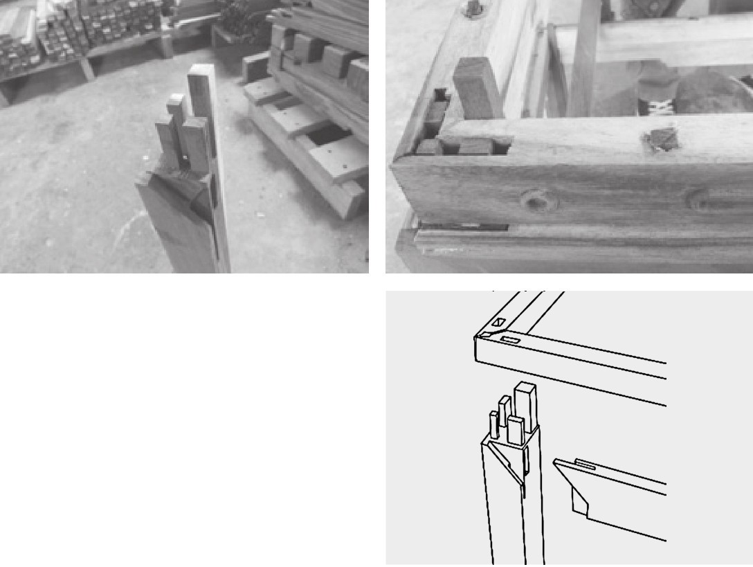 这里腿足与压线压条接合的方形榫头,由于机器设备的加工形成交叉的锯路,因其只出现在压线与腿足接合时,现将这种特殊形式称为压条榫,如图6-21压条榫所示。