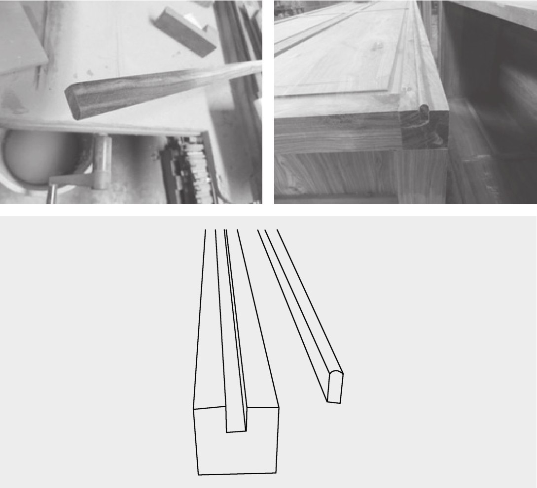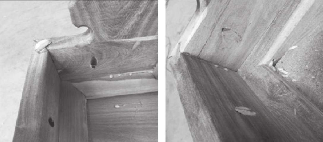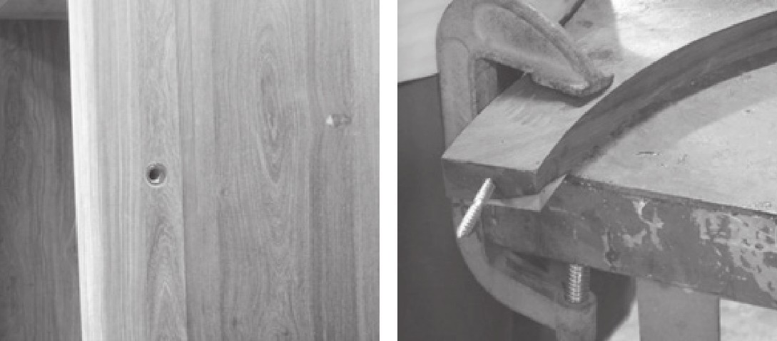 (2)钉接合。有的结构部位不出榫卯,在其中一个部件里面预埋螺钉,与另一构件接合,如图6-37所示;或者直接钻入螺钉连接两构件,这种钉接合表面的钻孔会用木塞填补,保持表面整洁,如图6-38所示。一般精细的做法会沿用传统榫卯工艺,不会采用这些仿榫五金件或者钉接合。