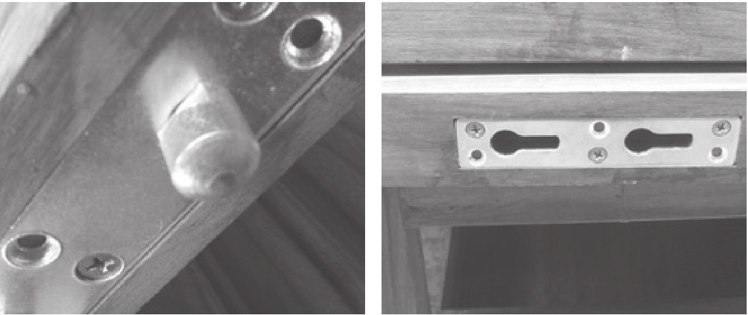 (1)仿榫五金件。根据榫卯接合的原理,制作五金件代替,装配在接合部位,比如根据走马销的接合原理,衍生出仿走马销的五金件,如图6-36所示。