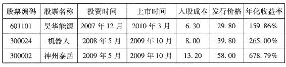 上市前持有中科电气(300035)300万股,投资于2004年8月,投资成本1元/股,2009年12月上市,公开发行价格36元,以首次发行价格计算获得投资收益10500万元,年均收益率656.25%;