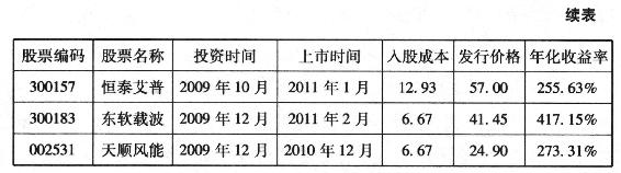 上市前持有新国都(300130)200万股,投资于2008年7月,投资成本6.67元/股,2010年10月上市,公开发行价格43.33元,以首次发行价格计算获得投资收益7332万元,年均收益率244.28%;