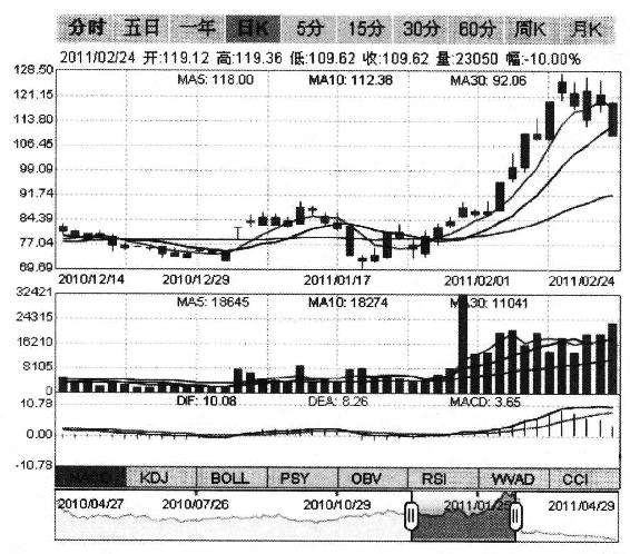 华平股份于2011年1月31日发布年报,公布了“10转15派10”的分配预案,由此也拉开了股价逼空式上涨的序幕:从1月28日的84元上涨到2月17日的128.5元(如图4-3所示),涨幅高达52.98%且期间几乎没有像样的回调,堪称年报高送转行情的经典案例。