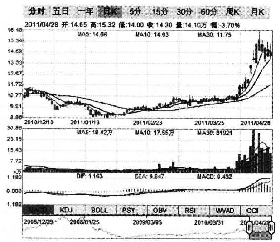 究其原因也无非是由于2010年11月以8.08元的价格非公开发行3412.03万股。但是在发布年报前公司股价最低时已经跌落至8.86元,导致参与定向增发的机构获利不足10%。而年报公布当天,公司股价即封住涨停,随后便连续大涨,最高时达到16.49元(如图4-2所示),已远大大高于当初的增发价,令参与定向增发的机构赚得盆满钵满。