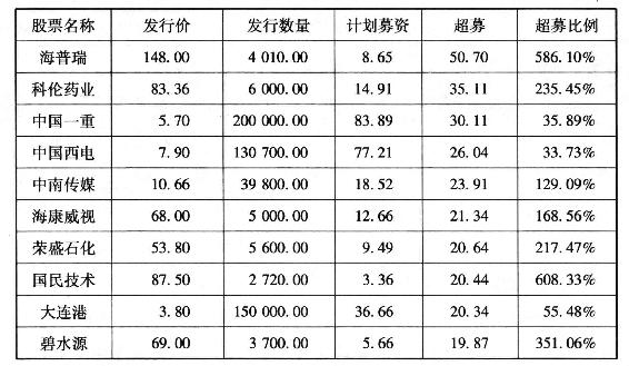 如果认为超募之祸只存在于中小板和创业板当中,主板发行股票泡沫成分少,则也不尽然。统计了2010年超募金额排名前10位的上市公司便不难发现,主板发行股票为4只,合计超募100.4亿元,占比为37.39%,中小板和创业板发行股票为6只,合计超募168.09亿元,占比为62.61%。可见对于超募资金的形成,主板股票以其“体积”见长,而中小板和创业板则以“数量”占优,二者难分伯仲。
