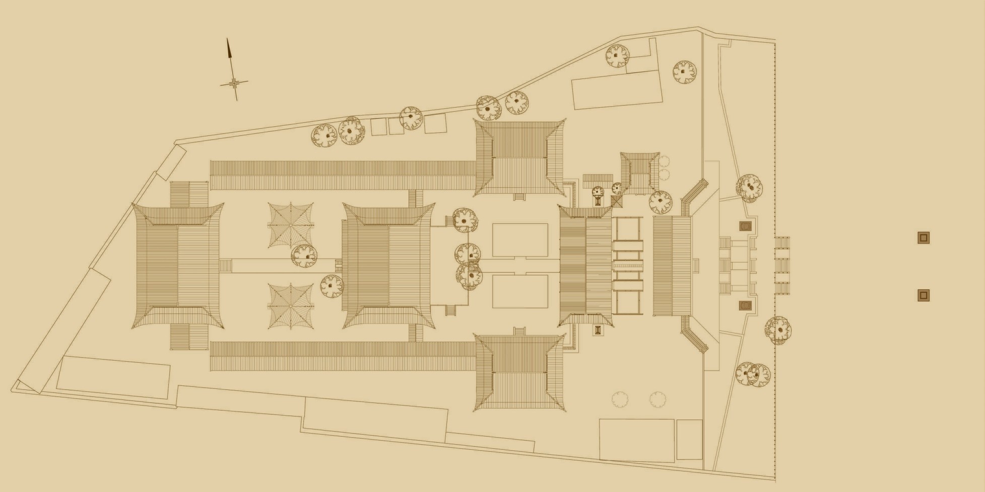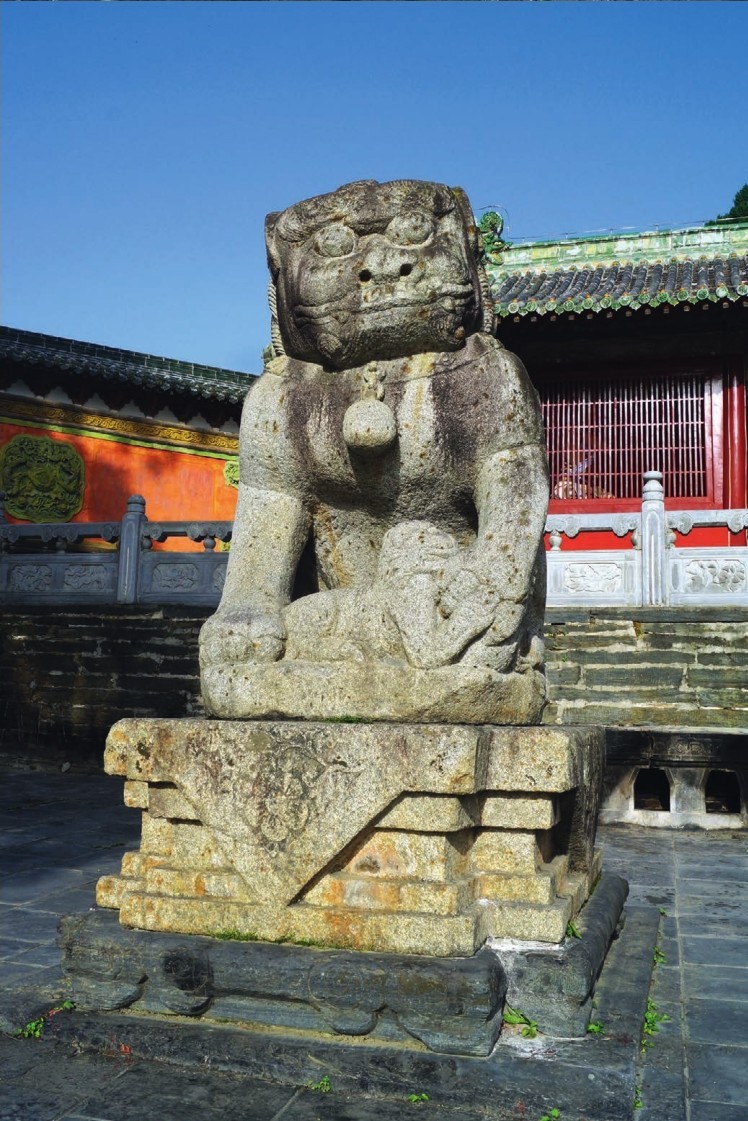 山门阶梯两侧各立一圆雕石狮,蹲坐于花岗石须弥座上。左为雄狮,颈下铃铛上阴刻“狻猊”二字,右前爪抚弄绣球一只,绣球上彩带翻飞。右为雌狮,左前爪轻抚一只幼狮。两狮形象威武生动,将山门衬托得森严雄伟。