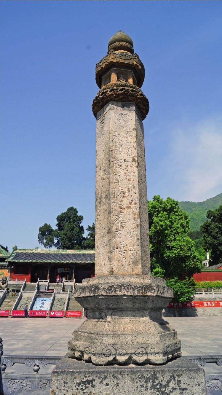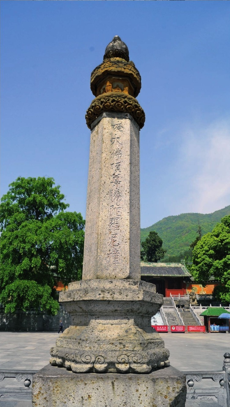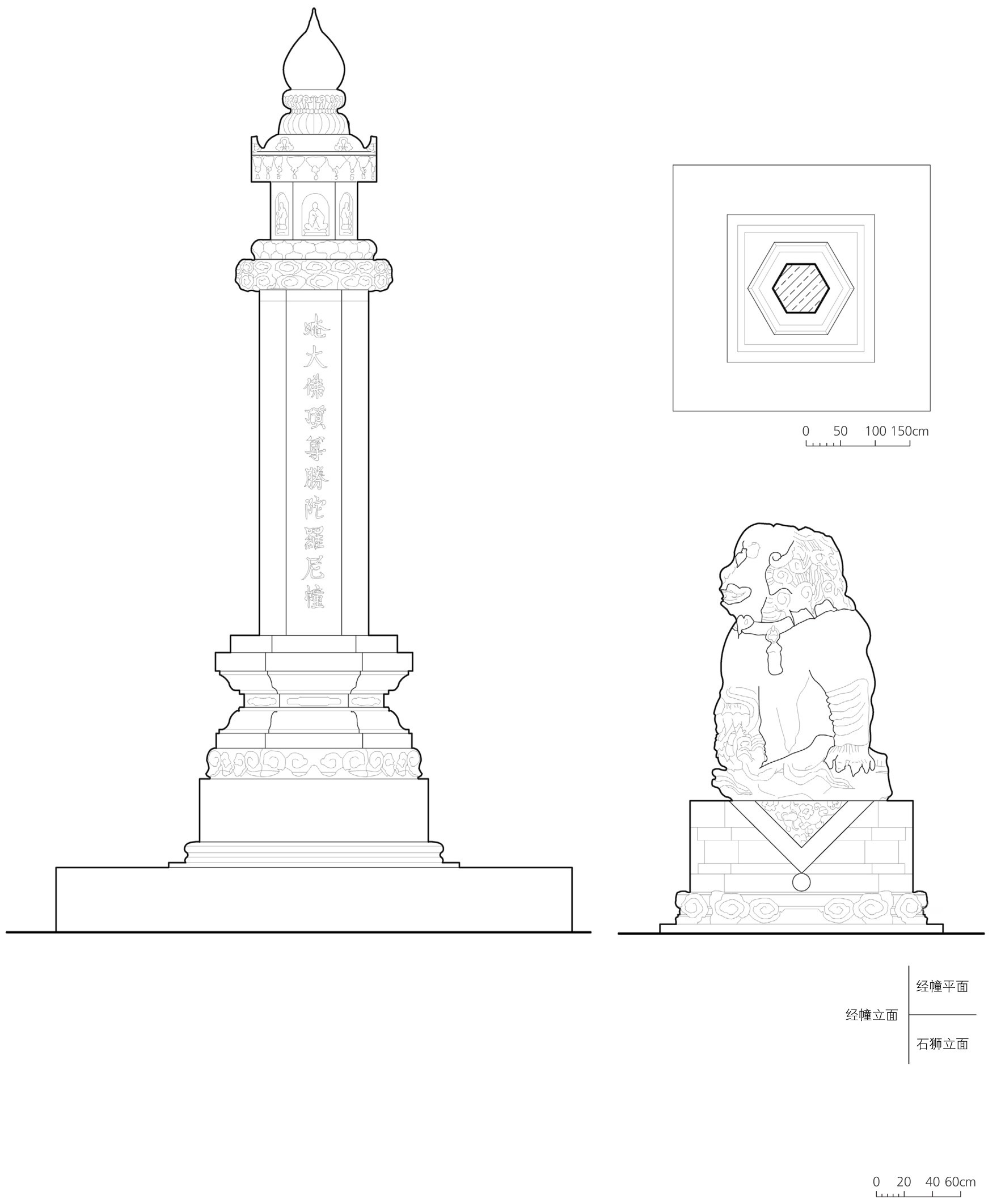 幢身由底座、须弥座、柱身、幢顶四部分组成。幢底为四边形花岗石底座,其上承六边形花岗石须弥座,座底圭角刻卷云,束腰六角部石刻角柱。须弥座上置地栿,再上为六边形花岗石幢身,幢身正面刻“唵大佛顶尊胜陀罗尼幢”,另五面刻藏、汉两种文字的“陀罗尼经文”,笔画圆润,字迹秀美。幢顶由下至上依次为流云、仰莲、短柱、华盖、宝珠宝顶。