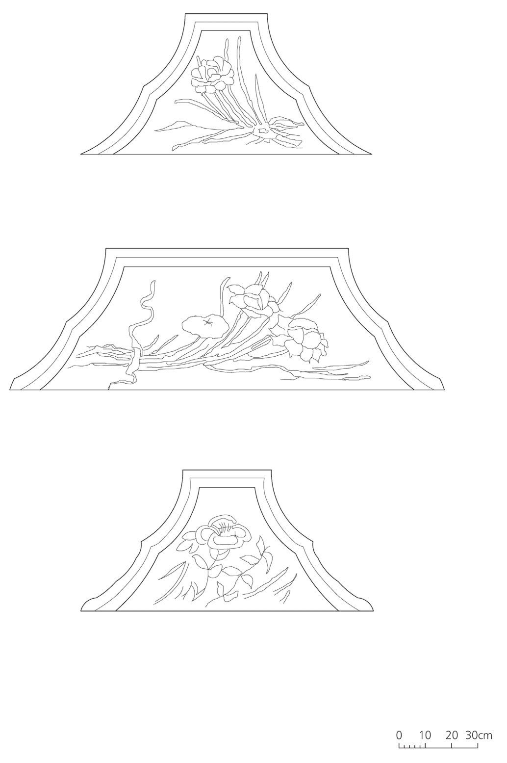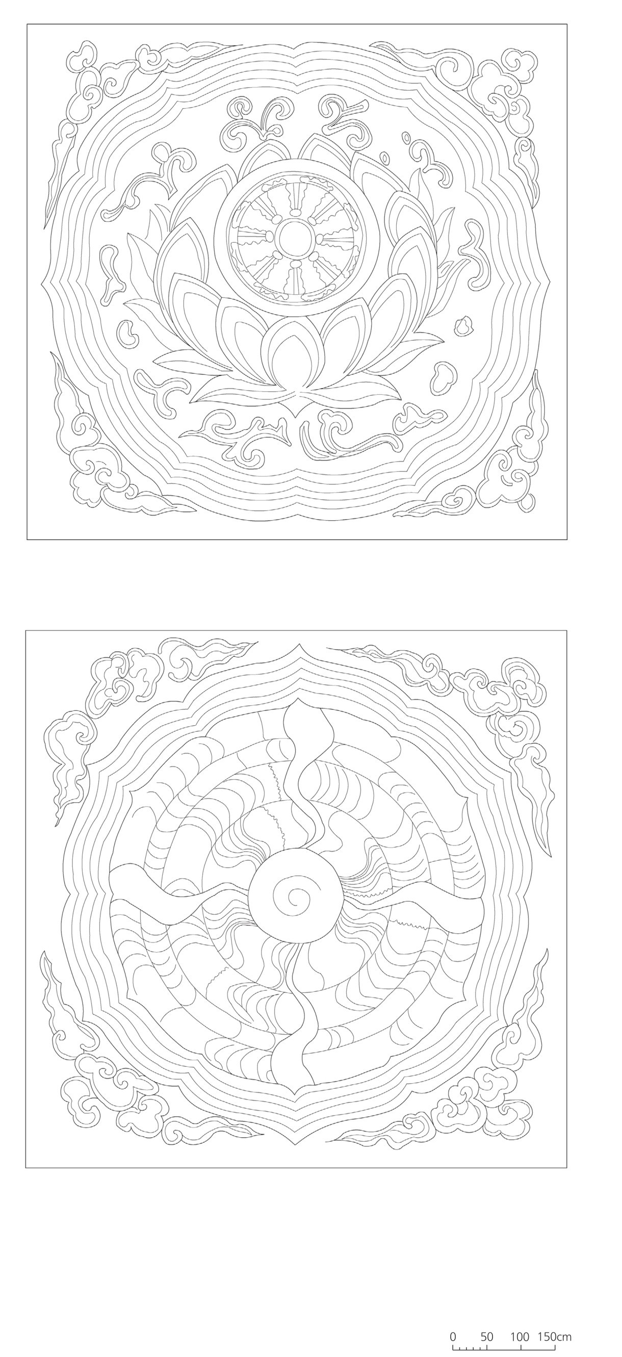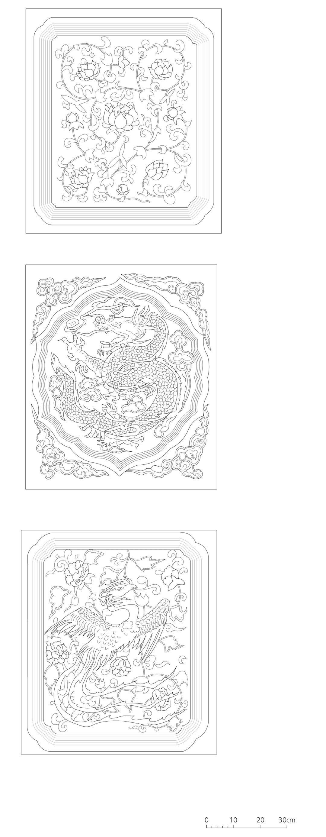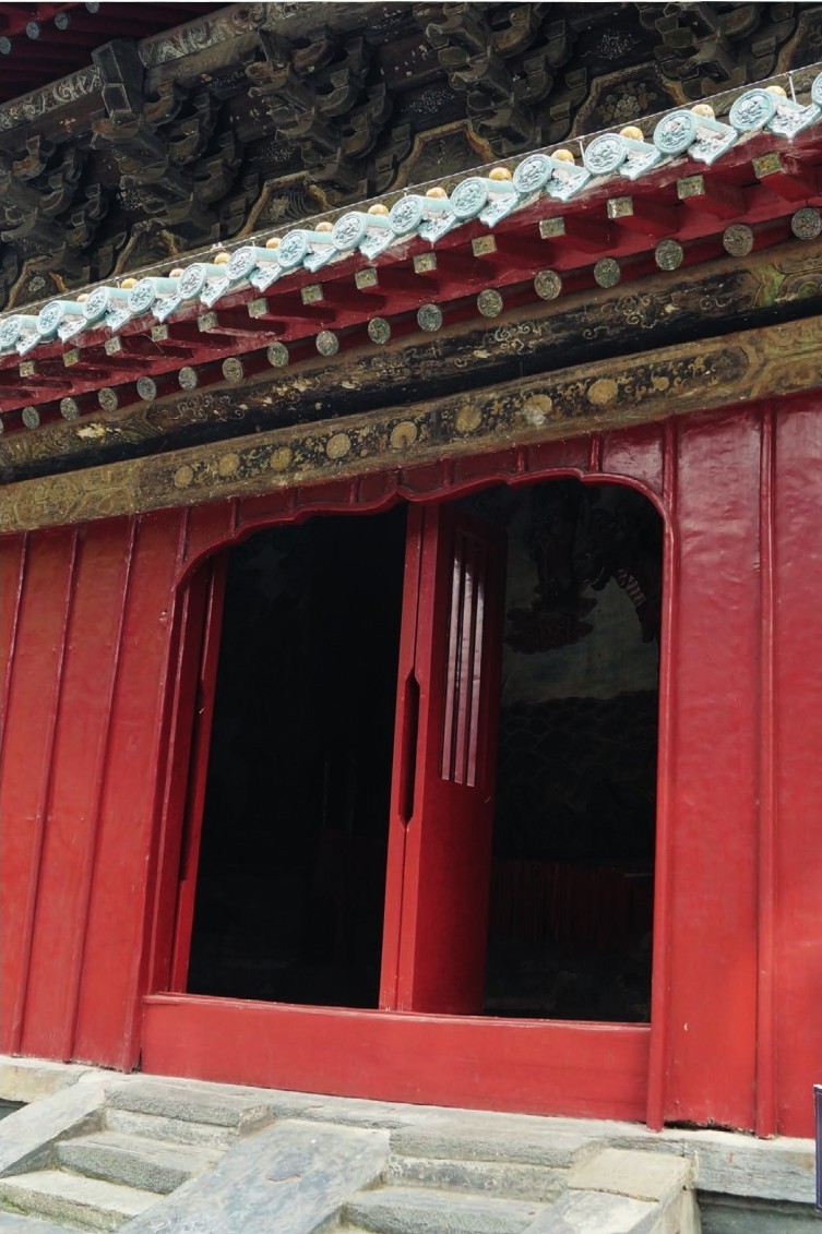台基及地面:台基为须弥座,前出月台,正面石砌双阶七级垂带踏跺一道。台面墁铺方形石板,四周及台基前檐勾栏现大部不存。殿内墁以金砖,明间前槽地面,镶嵌琉璃花砖。