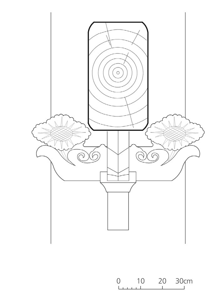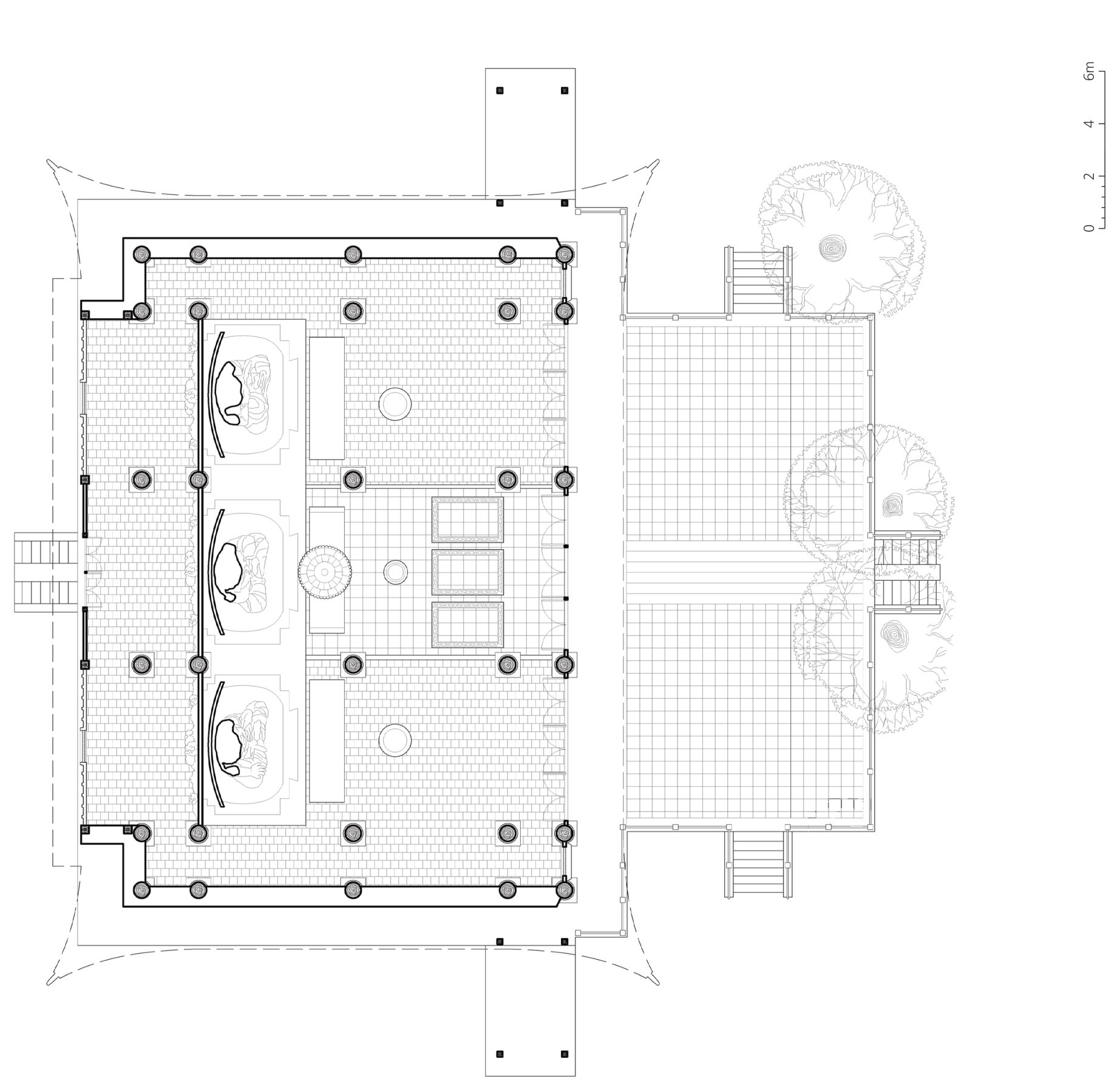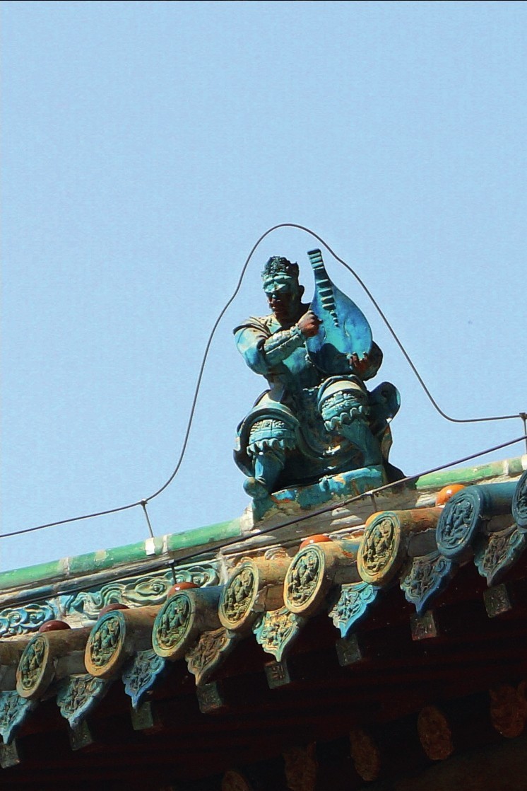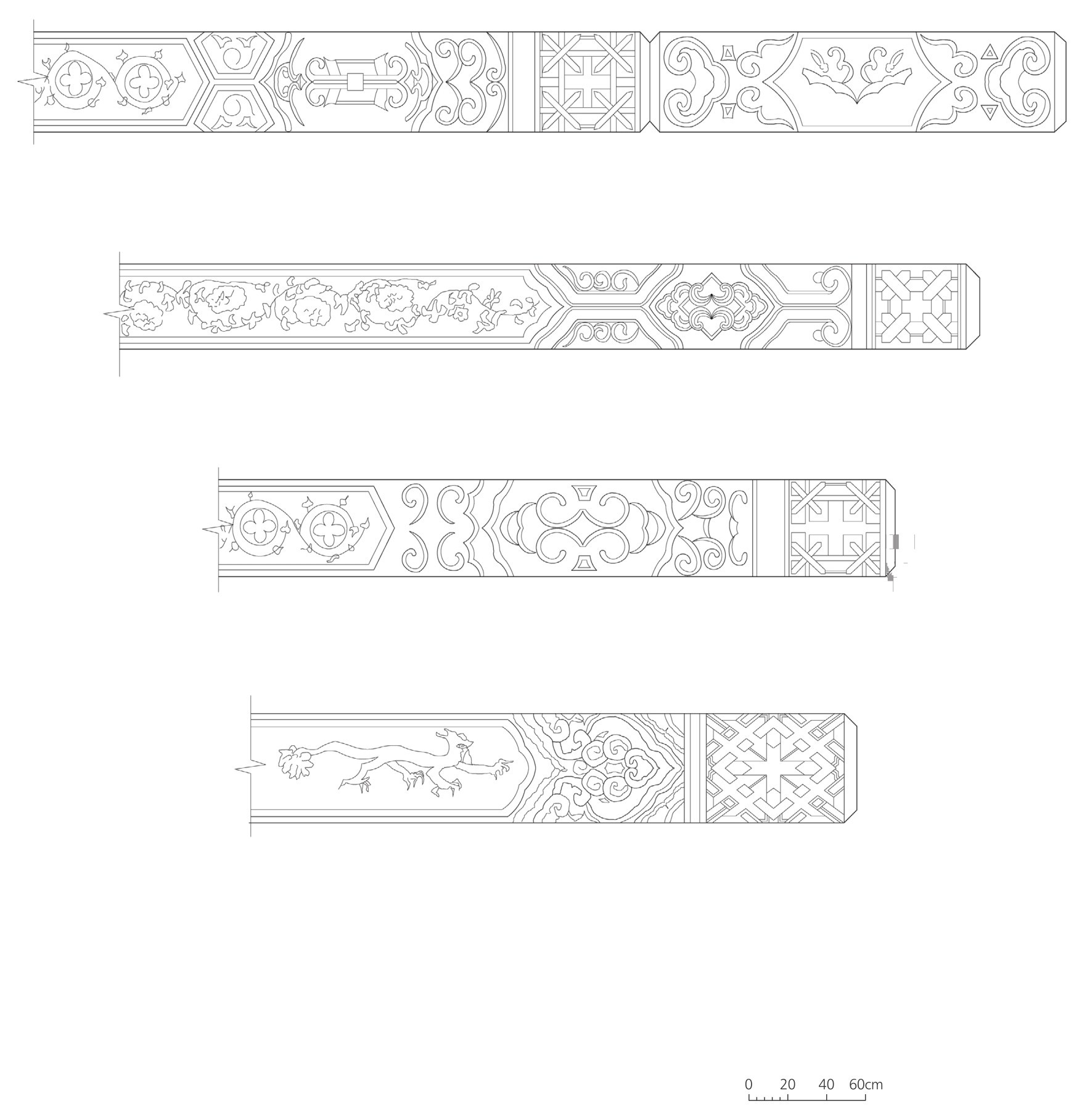 台基及地面:台基为须弥座,前出月台,正面石砌双阶七级垂带踏跺一道。台面墁铺方形石板,四周及台基前檐勾栏现大部不存。殿内墁以金砖,明间前槽地面,镶嵌琉璃花砖。