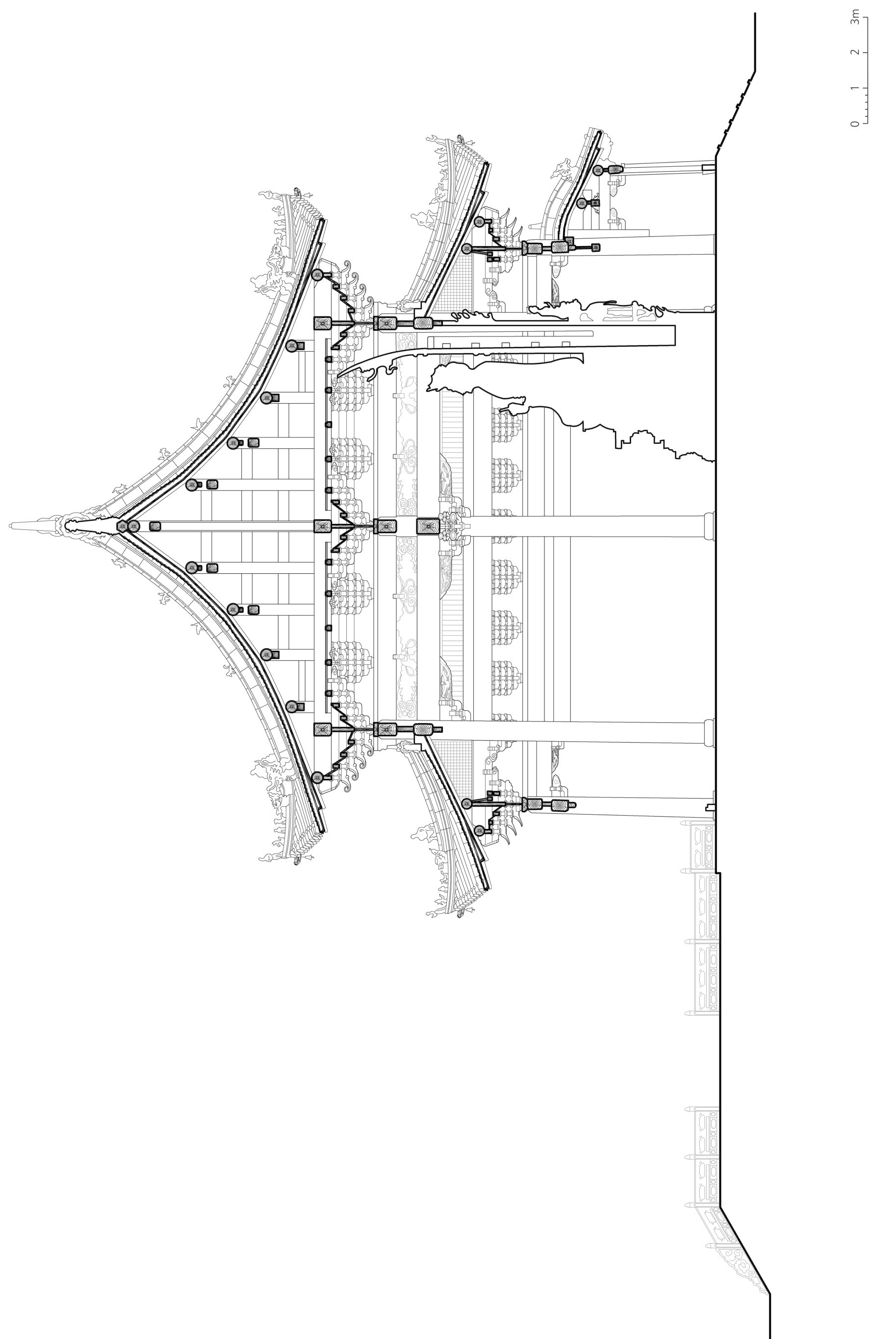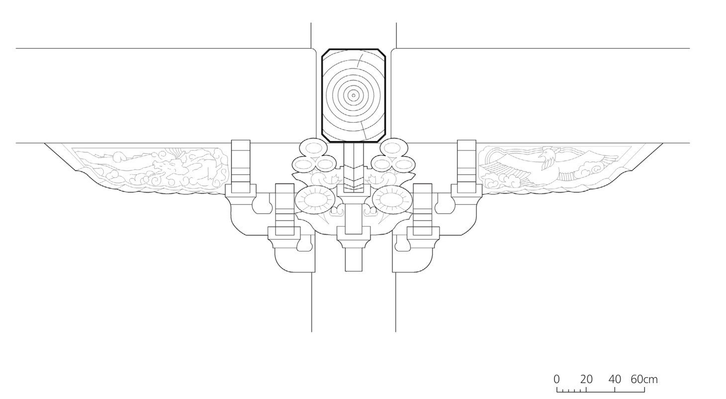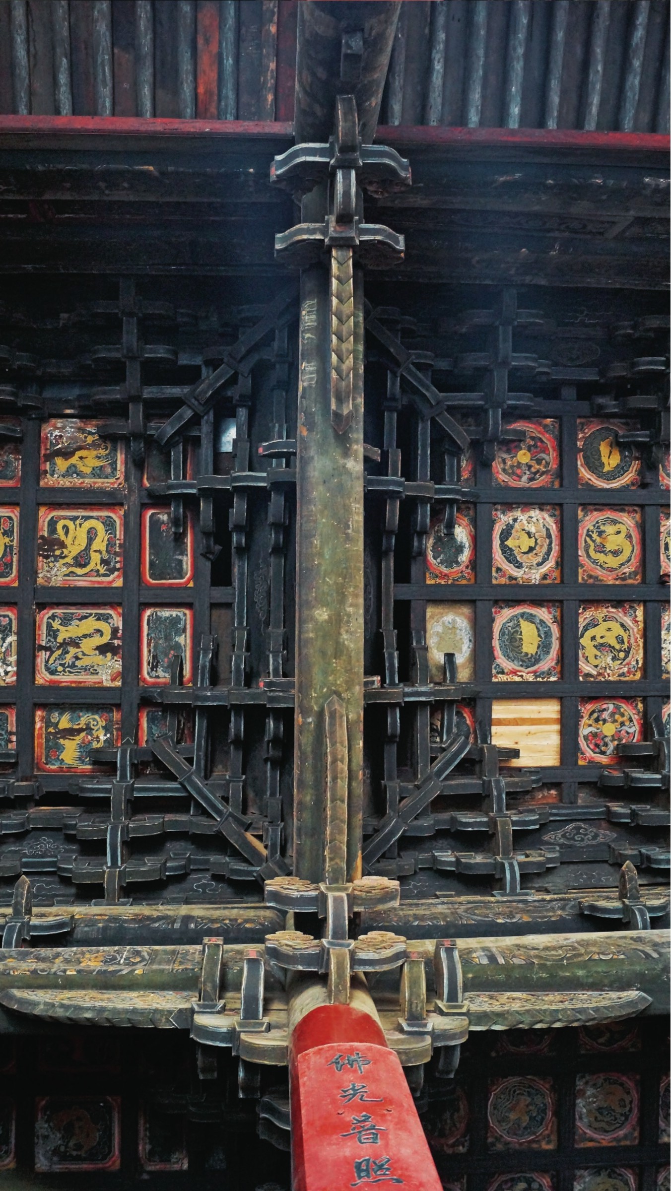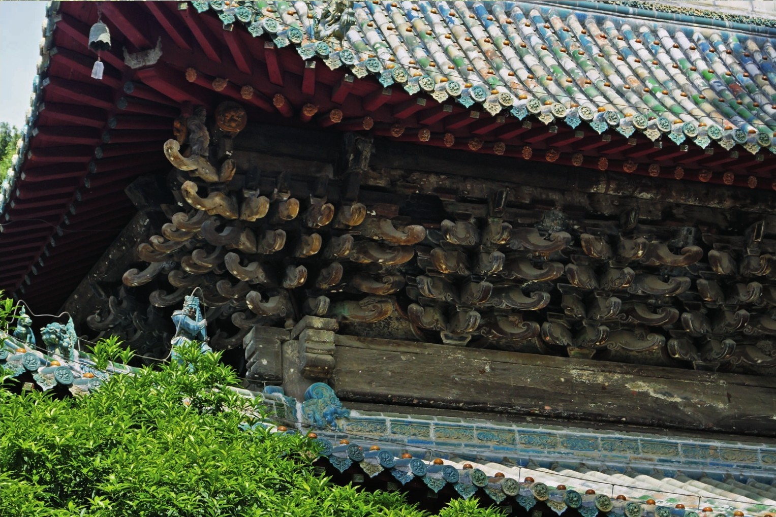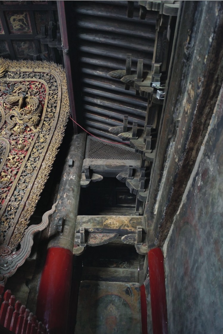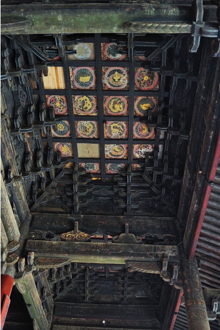 斗栱:下檐明次间置平身科四攒,上檐明次间置平身科三攒,下檐稍间不置平身科。两山仅二、三间下檐施平身科三攒,上檐施平身科二攒。下檐施七踩三昂斗栱,昂为琴面昂。上檐施九踩四昂斗栱,左右出45°斜昂,昂为象鼻昂。柱头科及角科翘、昂用材大于平身科。内檐斗栱用九踩四翘品字科,隔架科用三踩单翘品字科,上承雀替。