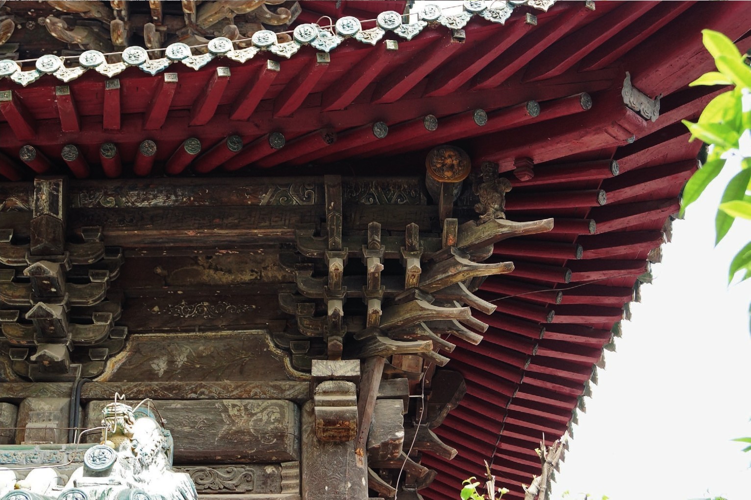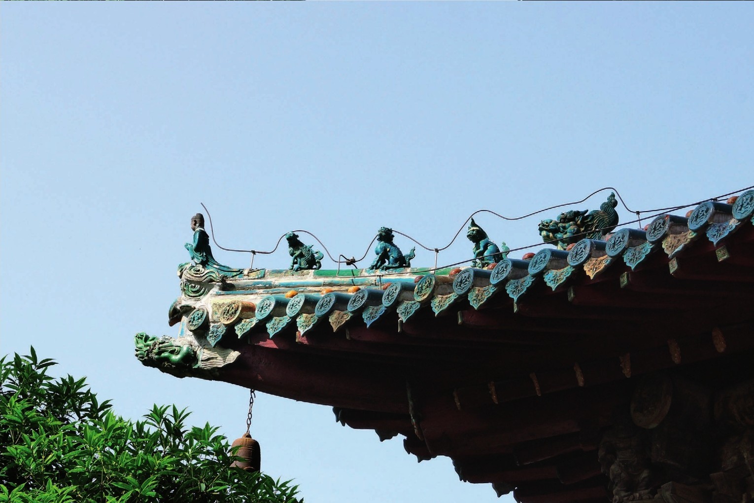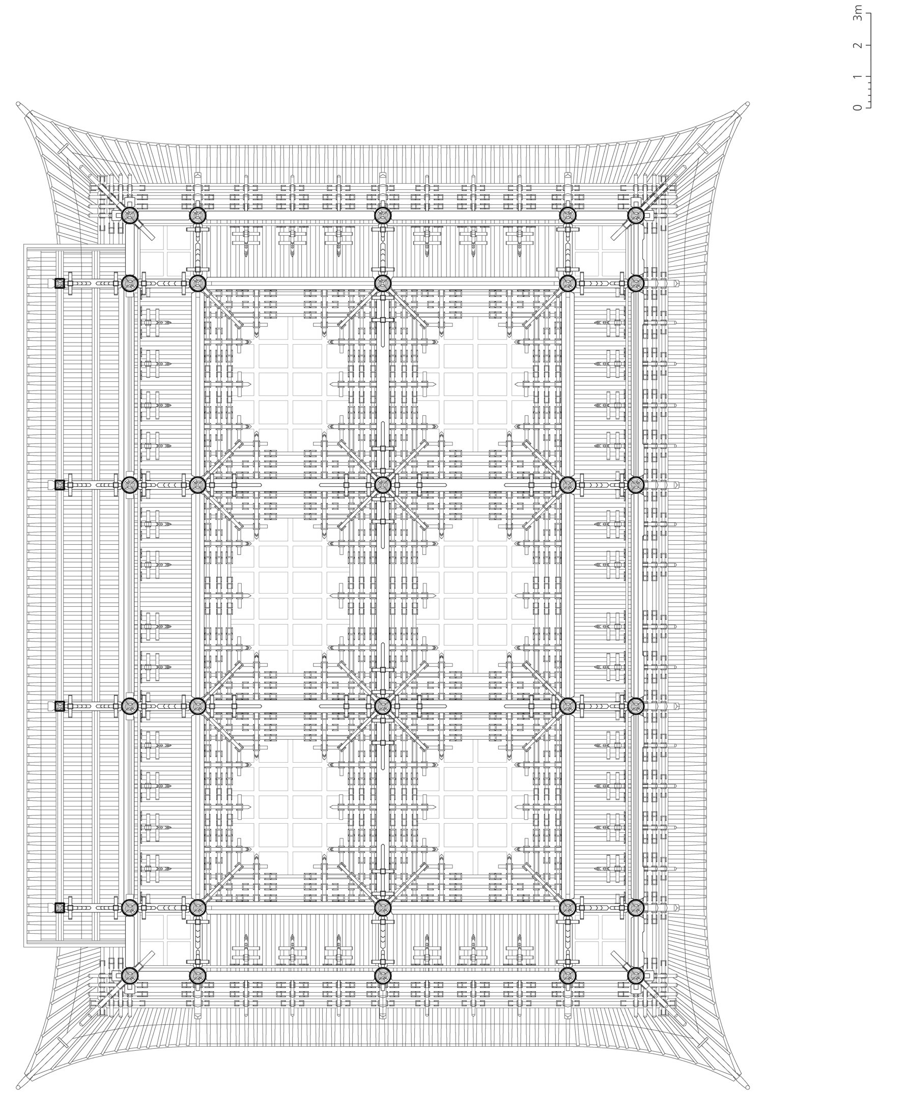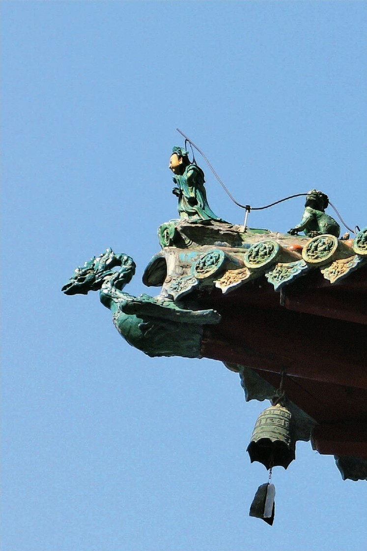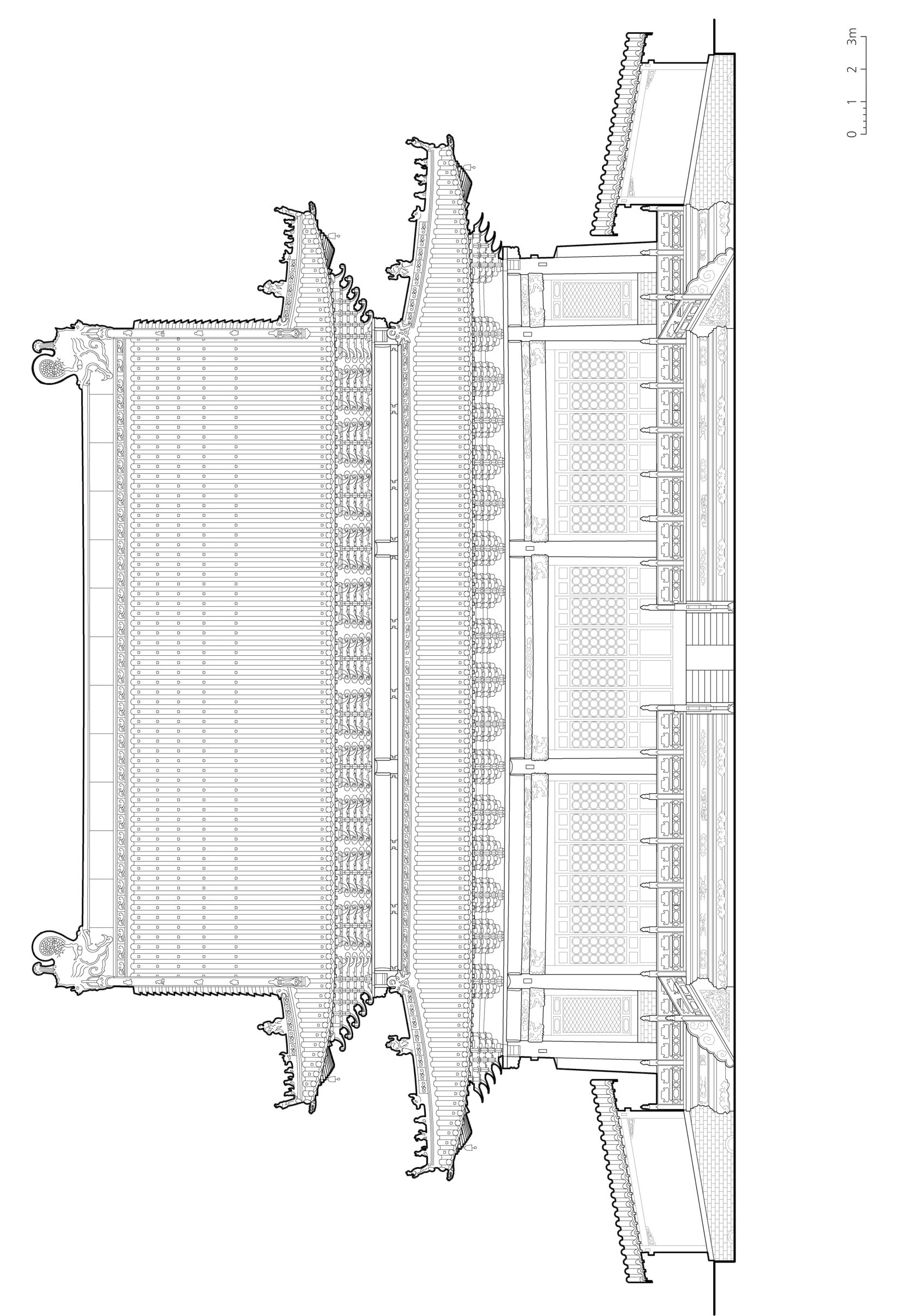 斗栱:下檐明次间置平身科四攒,上檐明次间置平身科三攒,下檐稍间不置平身科。两山仅二、三间下檐施平身科三攒,上檐施平身科二攒。下檐施七踩三昂斗栱,昂为琴面昂。上檐施九踩四昂斗栱,左右出45°斜昂,昂为象鼻昂。柱头科及角科翘、昂用材大于平身科。内檐斗栱用九踩四翘品字科,隔架科用三踩单翘品字科,上承雀替。