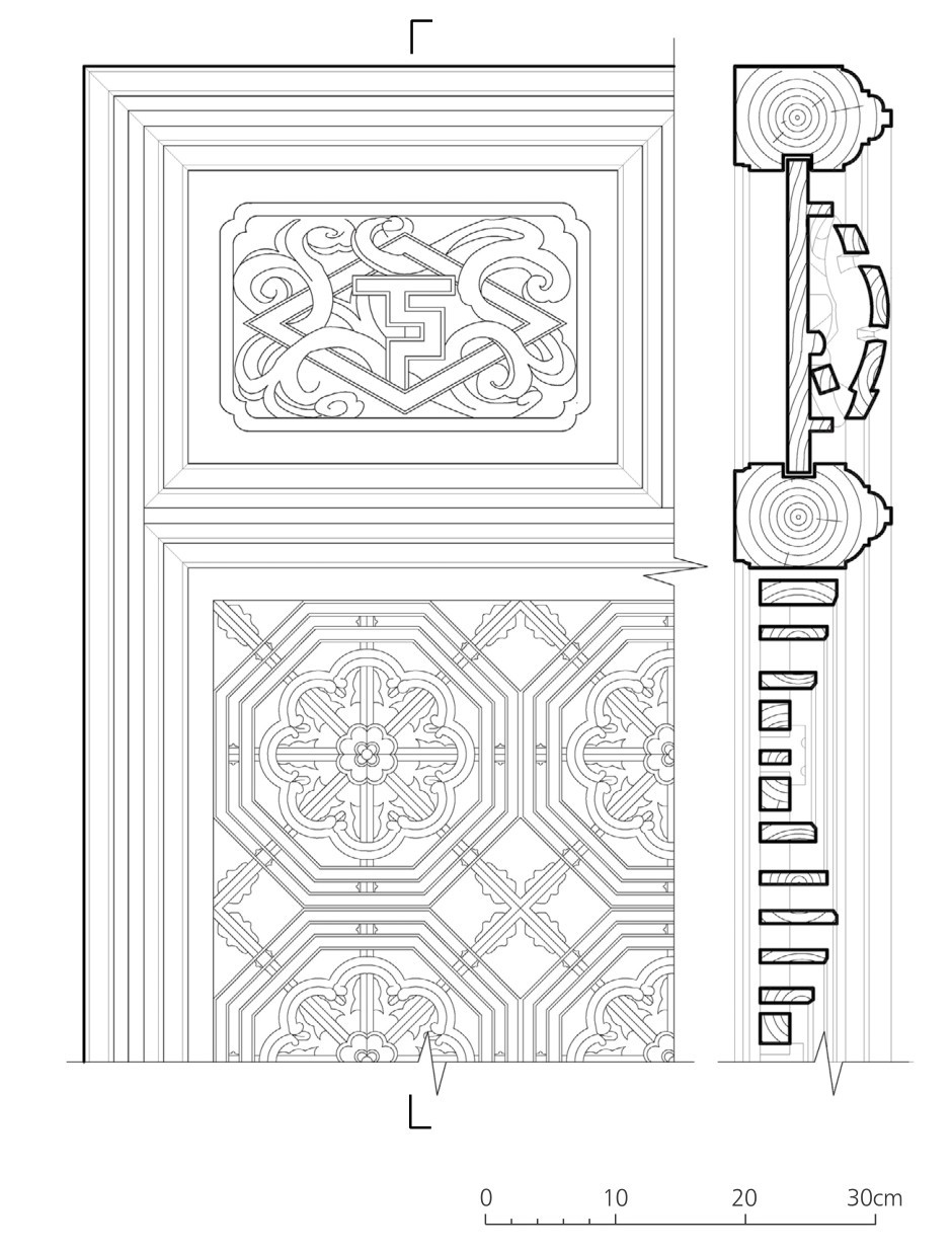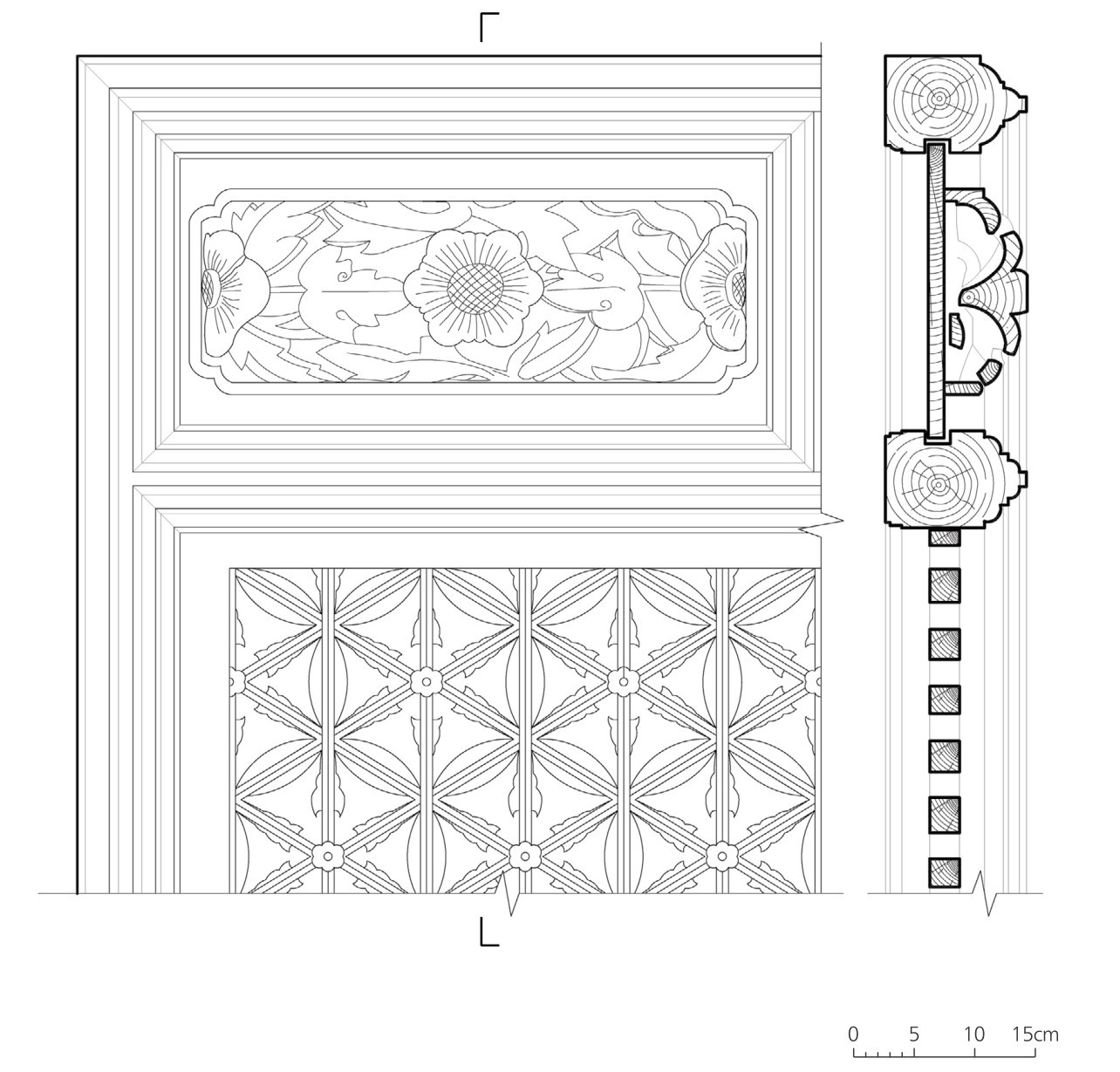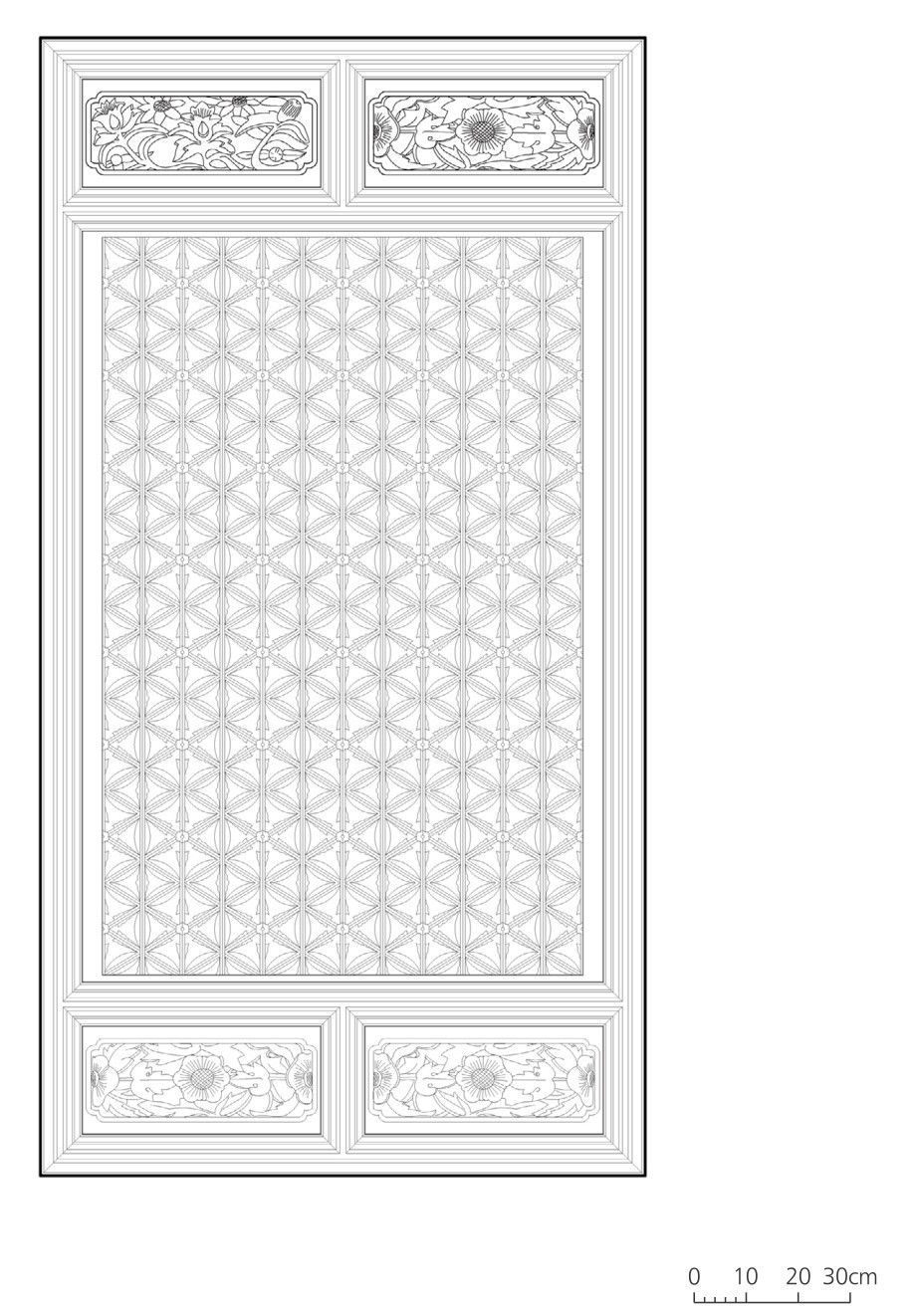 墙体及木装修:山墙为砖墙;前檐明次间置隔扇门,稍间为砖墙上置槛窗;后檐明间置壸门,稍间置壸窗。殿内柱头、梁、枋、斗栱、天花遍施彩画。