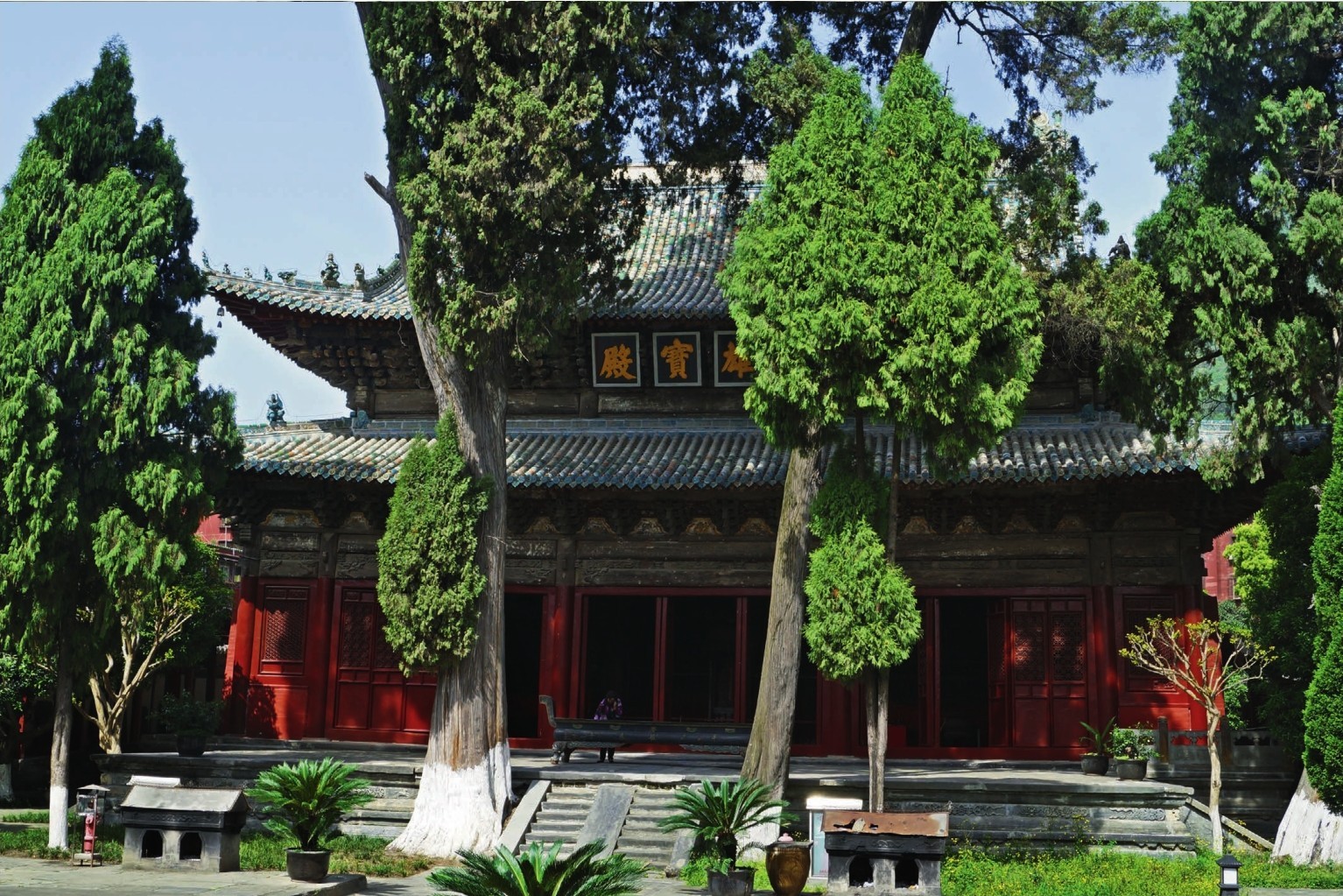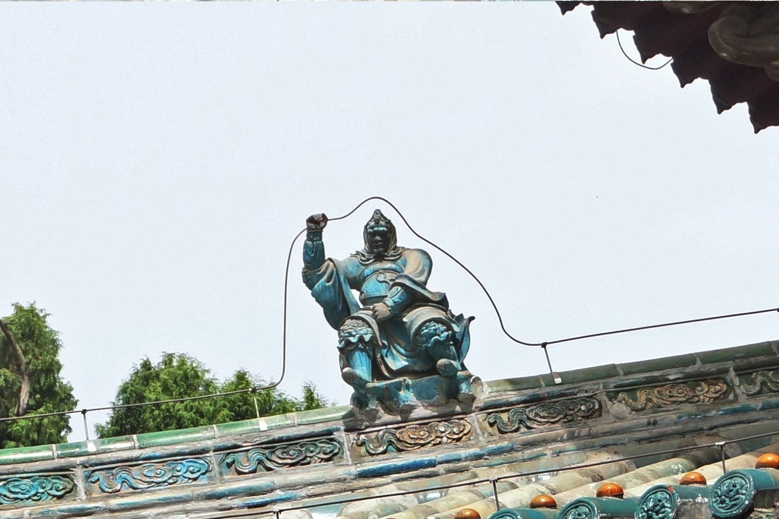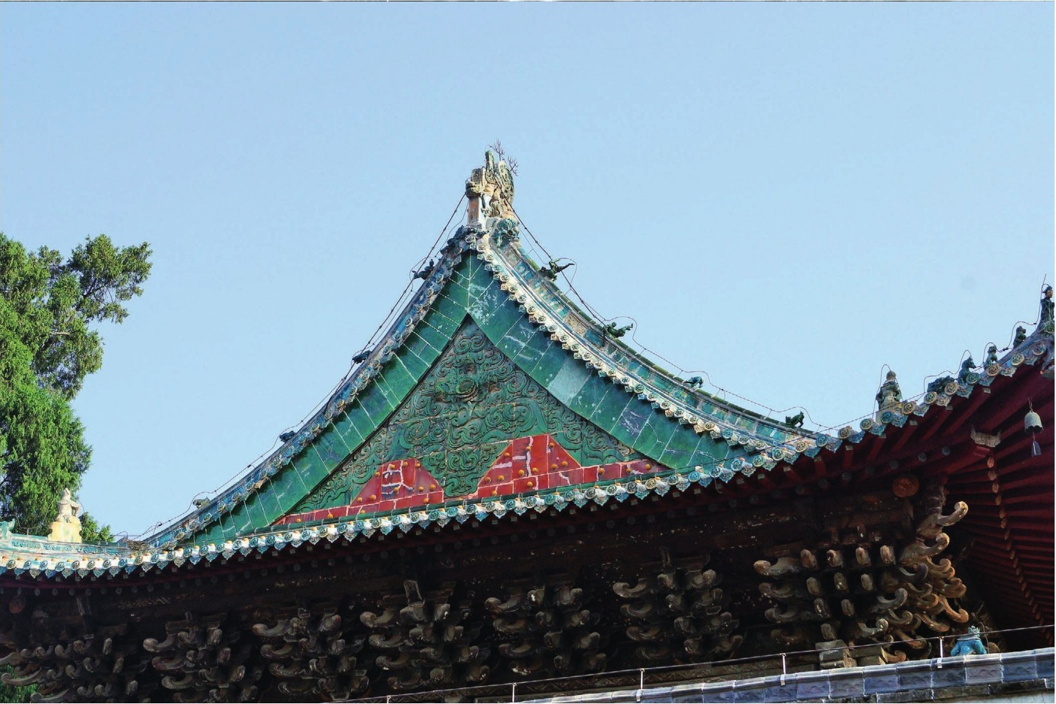 殿身分心槽加副阶周匝,通面阔五间计24.06米,进深四间计16米,后檐明次间再出副阶,使殿身平面呈“凸”字形;殿身前置月台。建筑南北置斜廊与南北廊庑连接,斜廊独立设置,卷棚顶。斜廊及月台为宋代建筑遗风。殿身重檐歇山顶,后檐副阶为单坡卷棚顶;屋面覆盖绿琉璃瓦。山花以绿琉璃砖拼装成云水莲花图样。殿堂式构架,草架为穿斗式,用生起、侧脚之制。