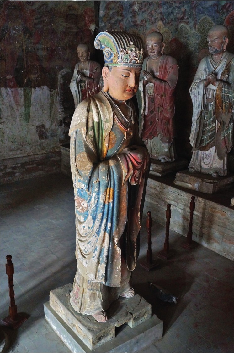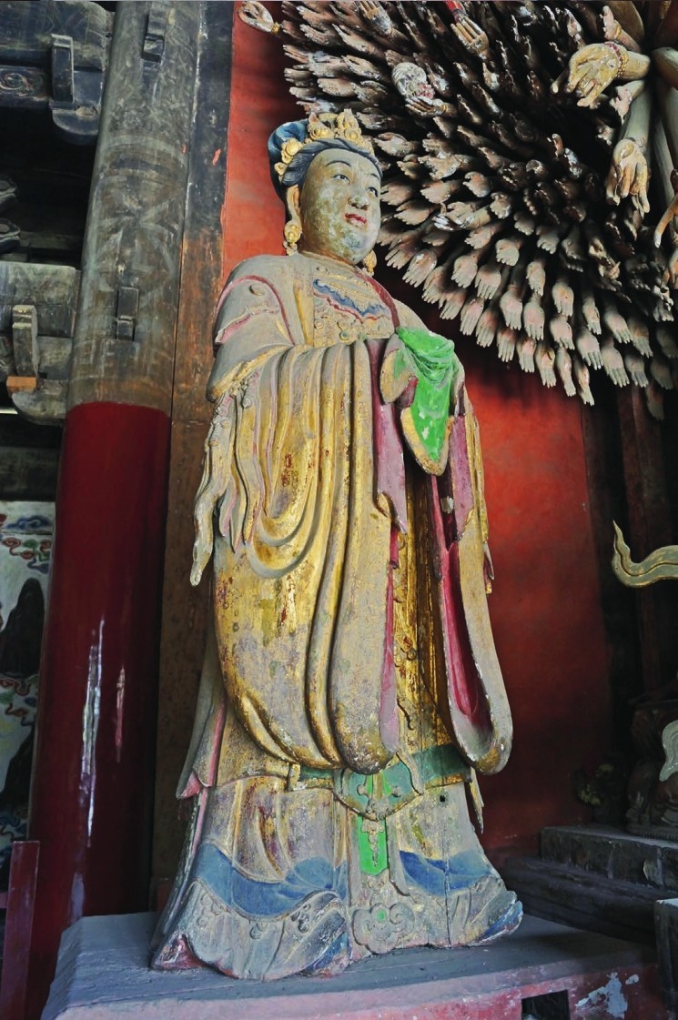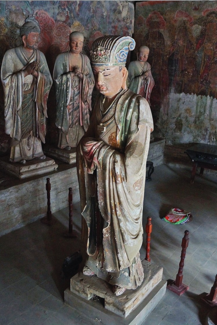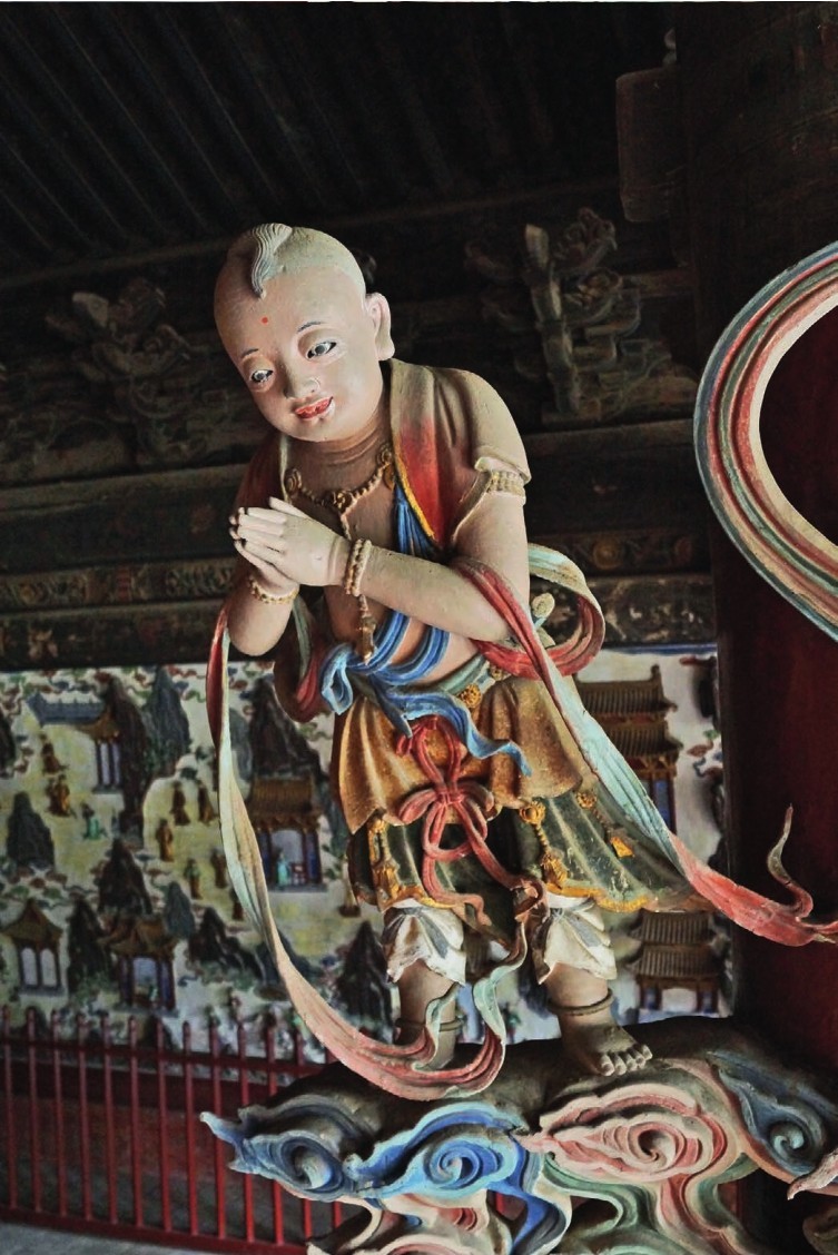 值得一提的是,寺内的彩塑受宋代以来日趋世俗化的影响,佛祖、菩萨、童子等造型日趋与老百姓接近,其造型都为世俗所喜闻乐见的形象,如佛祖的庄严祥和,菩萨的温和妩媚,阿难的朴实谦顺,迦叶的沉着认真,天王的威武强壮,力士的凶猛刚强,供养人的恭敬虔诚等,或许正是以此来吸引僧众和世俗的善男信女。对人物的刻画也是抓住其主要特点,如对迦叶刻画则是通过其满脸的皱纹、颈项间的筋骨、稀疏的牙齿,刻画出一个历经千难万苦的年长僧人形象。