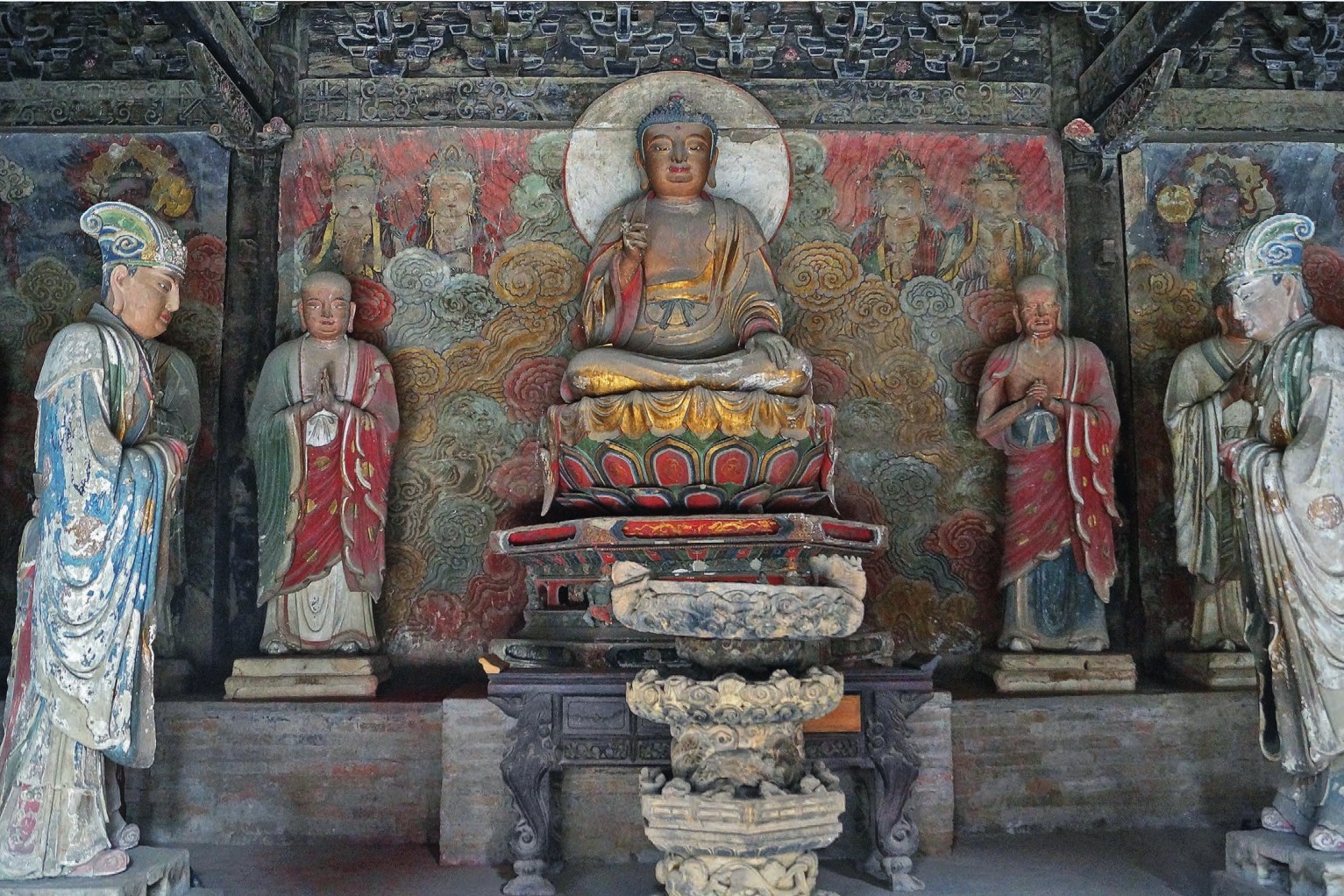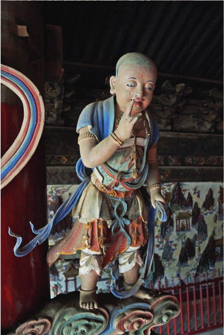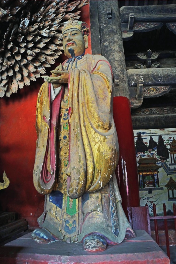 值得一提的是,寺内的彩塑受宋代以来日趋世俗化的影响,佛祖、菩萨、童子等造型日趋与老百姓接近,其造型都为世俗所喜闻乐见的形象,如佛祖的庄严祥和,菩萨的温和妩媚,阿难的朴实谦顺,迦叶的沉着认真,天王的威武强壮,力士的凶猛刚强,供养人的恭敬虔诚等,或许正是以此来吸引僧众和世俗的善男信女。对人物的刻画也是抓住其主要特点,如对迦叶刻画则是通过其满脸的皱纹、颈项间的筋骨、稀疏的牙齿,刻画出一个历经千难万苦的年长僧人形象。