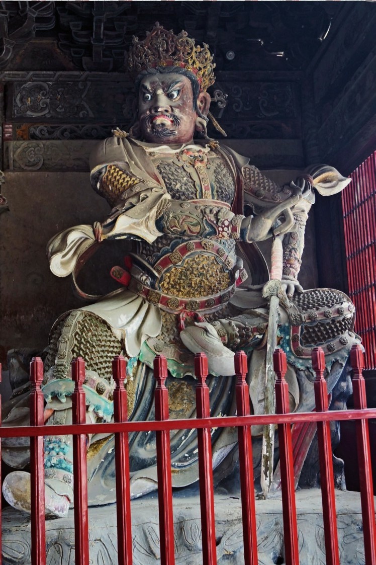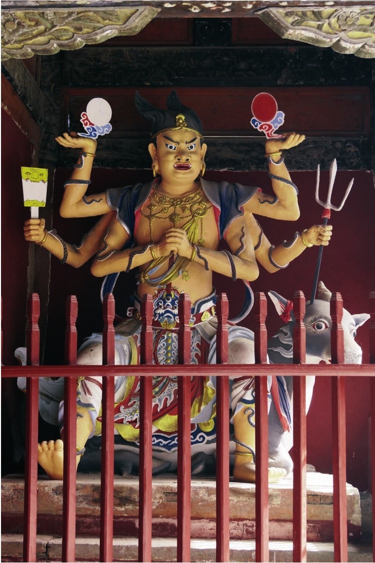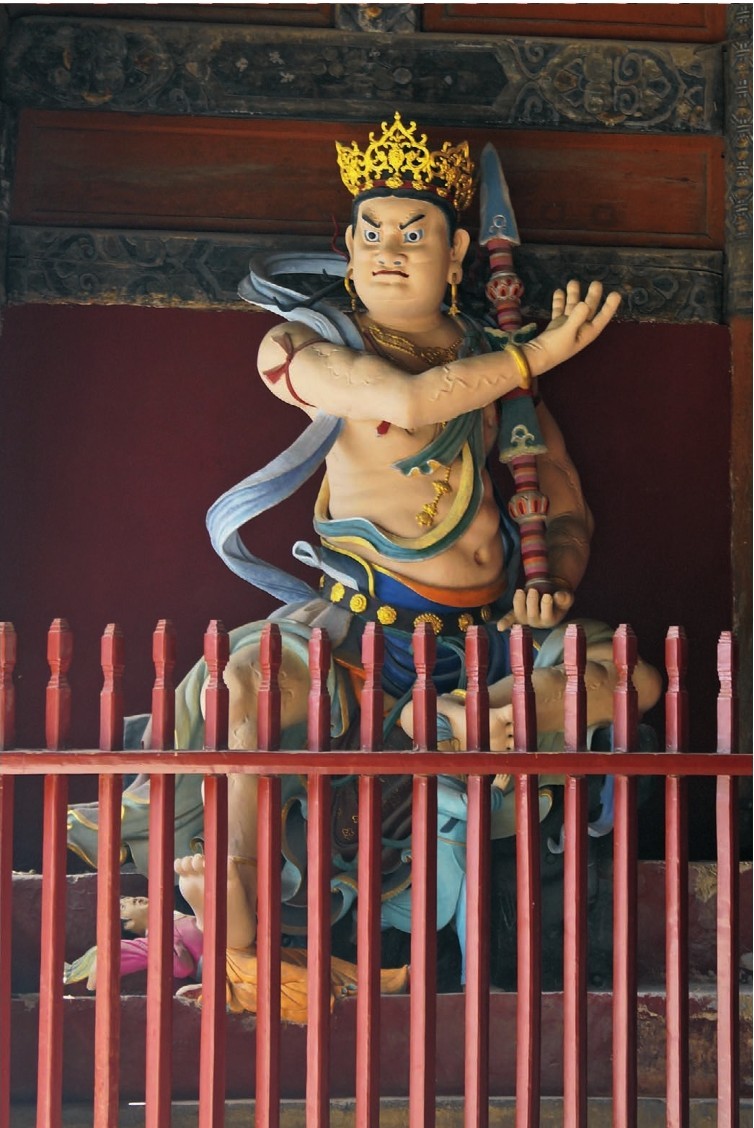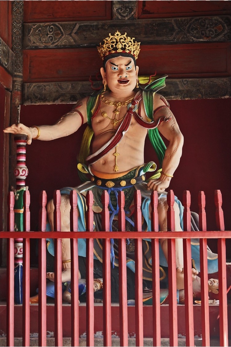 山门内、外两侧有金刚、明王塑像四尊。金刚力士像两尊,分布于门外两侧。这两尊像为佛教中的护法金刚——密迹金刚和那延罗金刚,民间俗称“哼哈二将”。哼哈二将手拿金刚杵,是保卫佛国的神。塑像愤怒的面部表情、夸张的肌肉,令进入寺内的善男信女们无不扪心自问善恶是非。门内左右为多头多臂的明王像,民间又称“三头六臂”“四头八臂”。像头戴幞头,着坎肩,上体裸露,下身着裤,手执法器,赤脚坐于坐骑背上。像高约4米,剑眉竖立,双目圆睁,威猛的架势令人望而生畏。