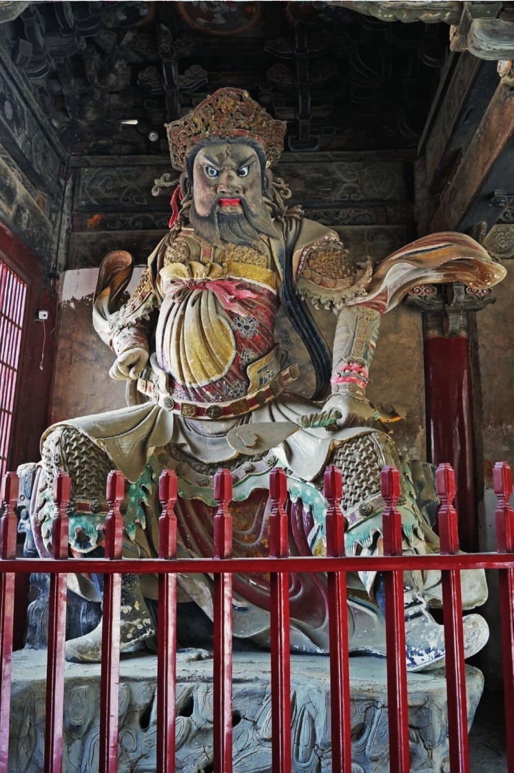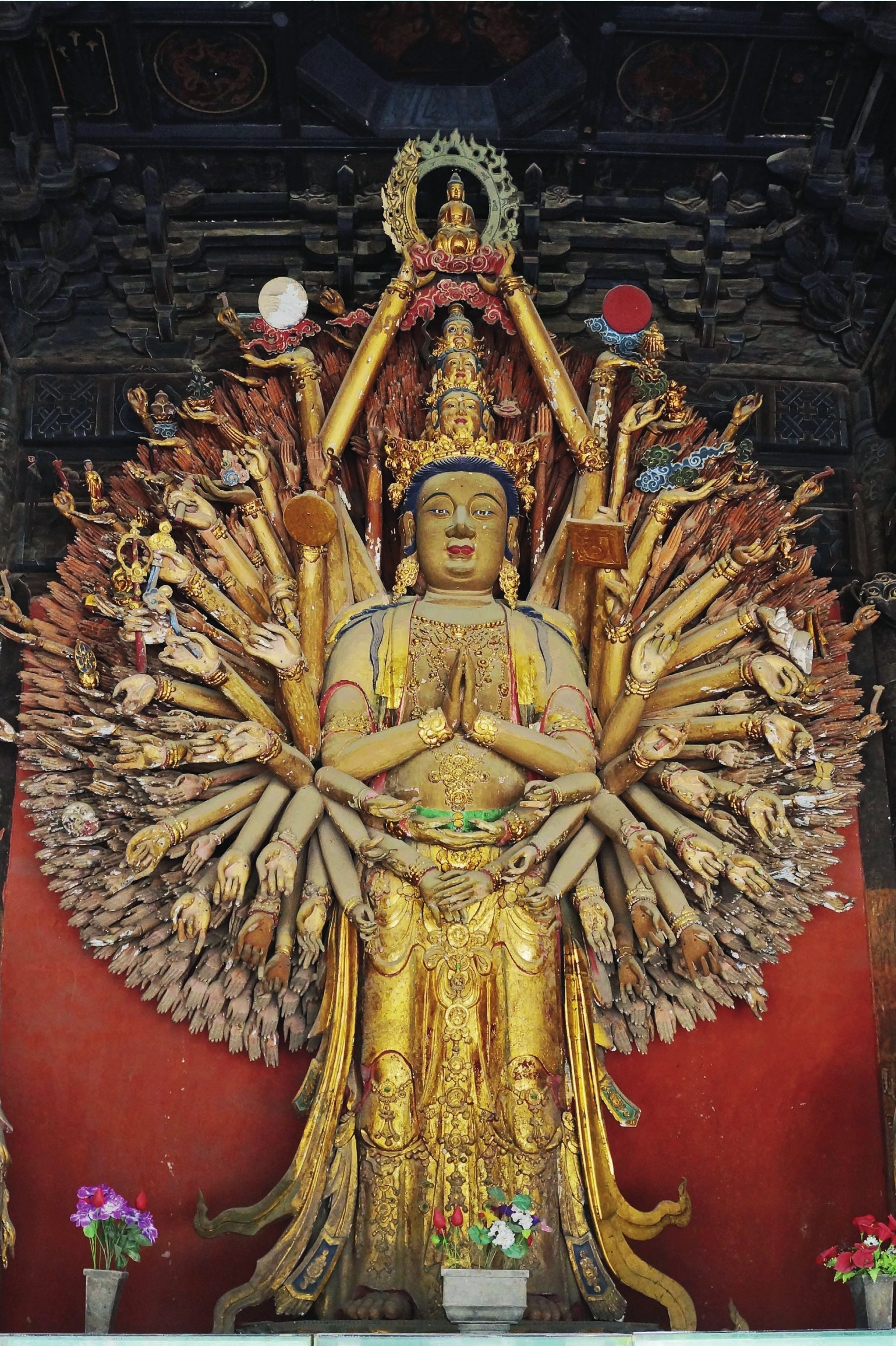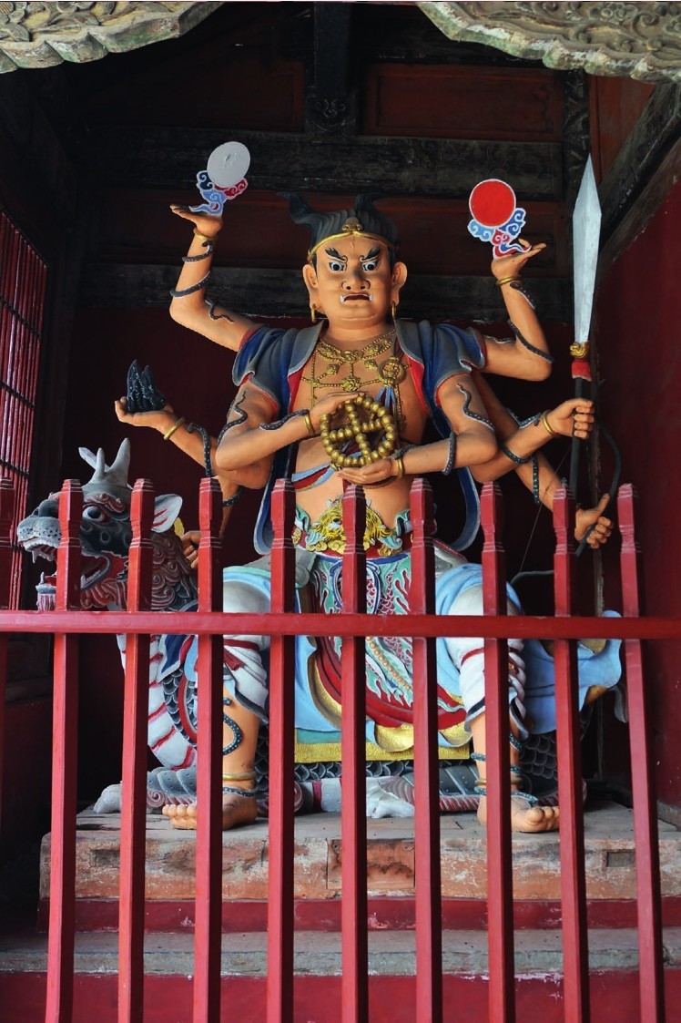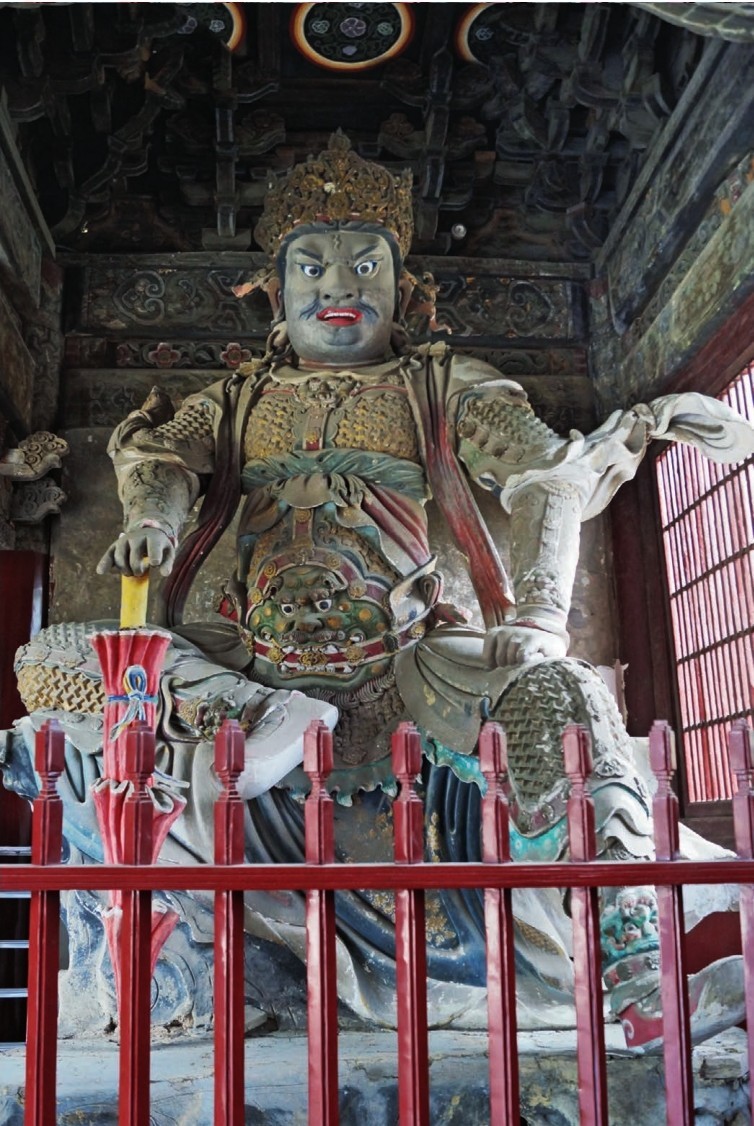 山门内、外两侧有金刚、明王塑像四尊。金刚力士像两尊,分布于门外两侧。这两尊像为佛教中的护法金刚——密迹金刚和那延罗金刚,民间俗称“哼哈二将”。哼哈二将手拿金刚杵,是保卫佛国的神。塑像愤怒的面部表情、夸张的肌肉,令进入寺内的善男信女们无不扪心自问善恶是非。门内左右为多头多臂的明王像,民间又称“三头六臂”“四头八臂”。像头戴幞头,着坎肩,上体裸露,下身着裤,手执法器,赤脚坐于坐骑背上。像高约4米,剑眉竖立,双目圆睁,威猛的架势令人望而生畏。