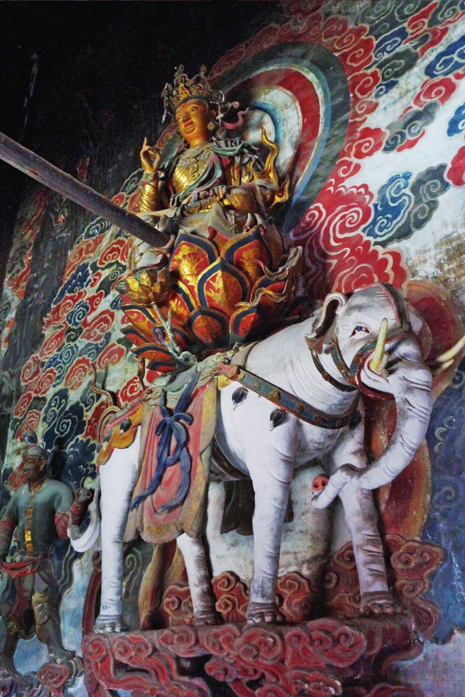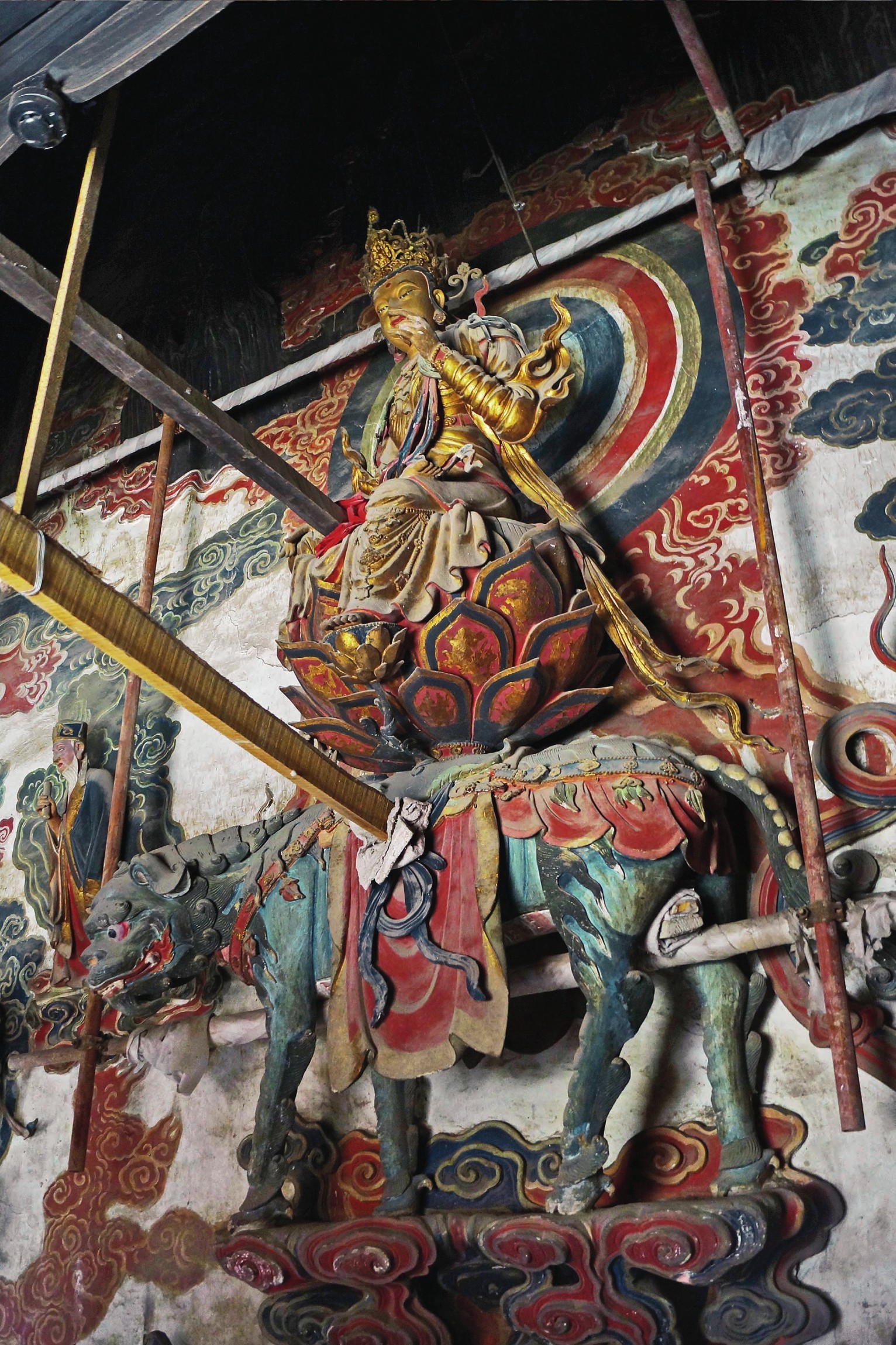 与正面“三身佛”相对应的背后的屏壁上,是一堂精美的壁塑。壁面上采取泥塑、壁画、影塑三者结合的方法,记述了“三大士”救苦救难、普度众生的情景。“三大士”彩塑,凌空高悬于“梵天佛地”之中。“三大士”像与正面的“三世佛”中隔板壁,像间有木骨相联,以使塑像稳固。整个壁面的背景如水、树木、祥云和头光、背光等多用彩绘壁画表示,山川、人物、树木和驯兽人、善财童子、龙女、供养人等多采用影塑,凸出于衬景。而整组雕塑的主体“三大士”则采用立体彩塑,更凸出于画面。整个壁面由圆雕、高浮雕和线描多种手法结合,极具视觉观赏效果。