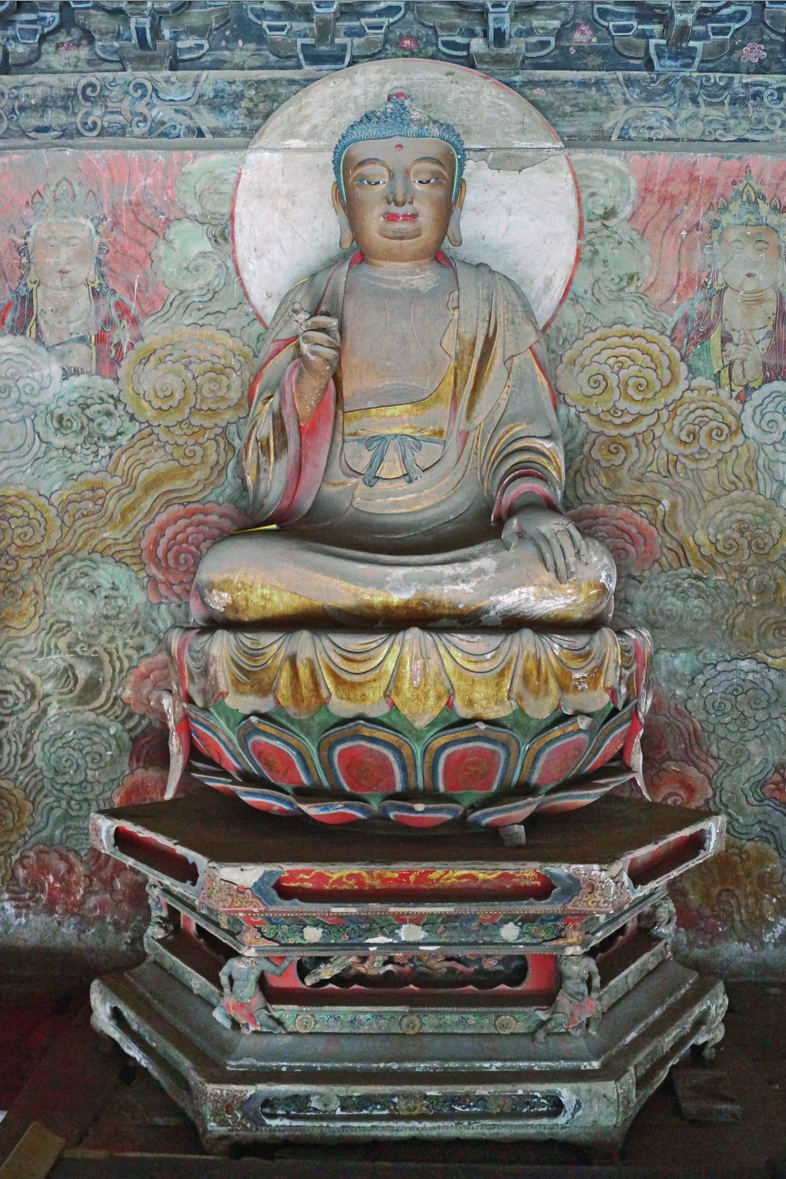 大雄宝殿为“三佛同殿”,即供“三身佛”:正中者为“法身佛”;左侧为“报身佛”;右侧为“应身佛”,即释迦牟尼佛之生身。“三身佛”的塑像及近长方形的高大的背屏装饰具有藏传佛教的因素,是汉藏文化交流的见证。泥塑位于正中一排三个“亞”字形须弥座。须弥座上下枋叠涩而出,枋上施鎏金花朵、卷草、龙、凤等,上下枭绘红色莲瓣(八达玛),束腰转角施呲牙咧嘴的夜叉、恶鬼和角柱,将其分割成不同的部分,束腰一般作几何形开光,内塑行龙、白象、麒麟、狮等,一般对称出现。须弥座上为莲花座,莲花座上为全身着金、结吉祥坐于莲花座上的“三身佛”。塑像通高7米,后有头光和背光,均附着于高大的背屏上。“报身佛”和“应身佛”即左、右两尊佛像,螺形肉髻,身披袈裟,袒右。双手结禅定印,结跏趺坐于须弥莲花座上。双目微微俯视,面带微笑,显得慈祥而又肃穆。中间的“法身佛”头戴镂孔佛冠,面部圆满;身着袈裟,双手结金刚语菩萨之印。