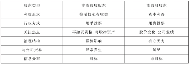在股权分置的情况下,由于股权被人为隔开,股东相应也分为两大阵营。这两大阵营的股东在利益追求、关注焦点等方面存在着诸多差异(见表2.1),他们的矛盾也是显而易见的。
