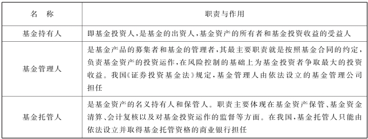 为了保障广大投资者的利益,防止信托财产挪为私用,投资基金实行经营和保管分开的原则:基金管理人只负责基金的日常管理和操作;基金托管人单独为基金设立独立的账户,按照基金管理人的指示保管和处分基金财产,并对基金管理人进行监督。我国《证券投资基金法》规定,基金托管人由依法设立并取得基金托管资格的商业银行担任。基金持有人、基金管理人、基金托管人的职责与作用如表4.1所示。