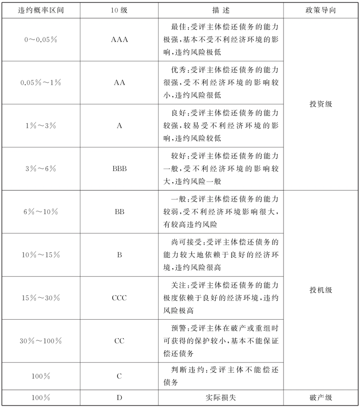 除AAA级、CCC(含)以下等级外,每一个信用等级可用“+”“-”符号进行微调,表示信用质量略高或略低于本等级。BBB-及以上的信用级别为投资级别,BB+及以下信用级别为投机级别。
