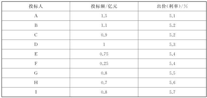 例如:某发行人拟发行债券5亿元,有9个投标人参与投标,他们的出价(所报出的利率)和投标额如表6.2所示。
