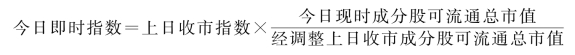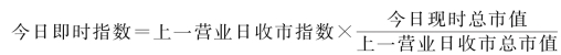 每一交易日集中竞价结束后,用集中竞价产生的开盘价(无成交者取昨日收盘价)计算开盘指数,然后用连锁方法定时计算即时股价指数,直到收市。每日连锁计算公式为: