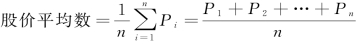 简单算术平均法即把纳入指数计算范围的股票(样本股票)市价加总,除以样本股票数,得出一个平均值即为股价平均数。若设采样股票数为n,各采样股票的市价为Pi(i=1,2,…,n),则: