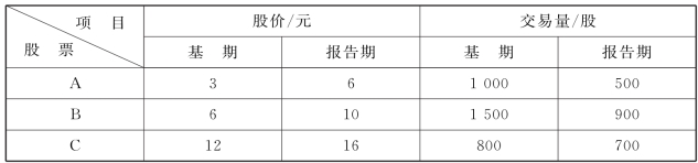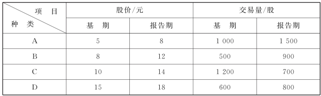 根据上表,试计算简单平均股价指数、综合平均股价指数和加权平均股价指数(分别以基期交易量和报告期交易量为权数计算)。