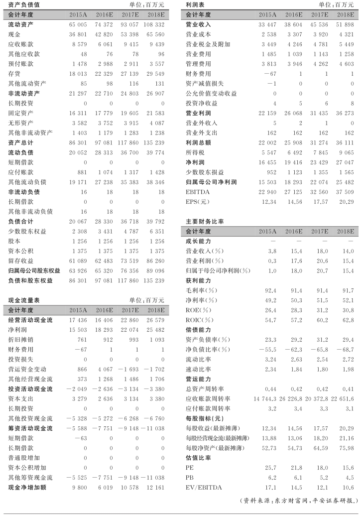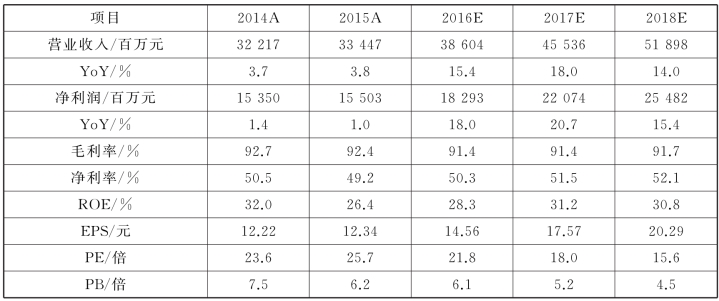 预计2016—2018年EPS为14.56、17.57(升4%)、20.29元(升8%),同比增长18%、20.7%、15.4%,动态PE为21.8、18.0、15.6倍。茅台可谓中国最佳消费品品牌,且2016—2018年是业绩增长小高潮,市场预期仍较预测低至少10%,且超预期概率仍高,机会成本下行背景下,估值亦有逐步上升空间。