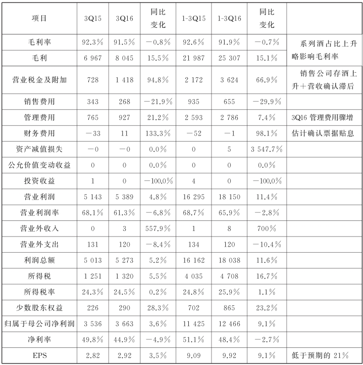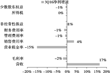 3Q16营收增长16.5%略低于预期的21%,考虑3Q16预收款大升60亿~174亿元,实际业务再超预期。受消费税率和管理费用骤升拖累,3Q16归母公司净利仅增3.6%,低于预期的21%。