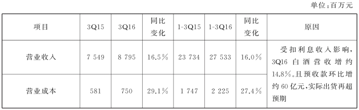 图9.3 3Q16酒类营收同比增长14.8%至84.6亿元