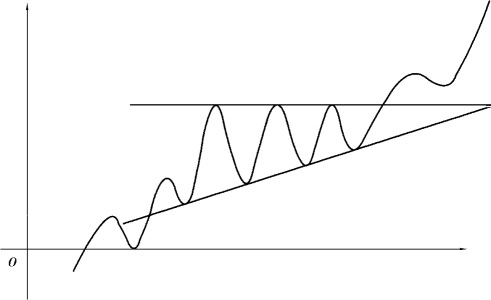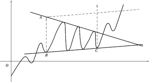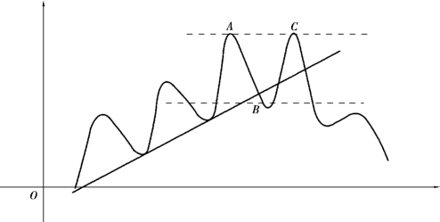上升三角形是对称三角形的变形。对称三角形有上下两条直线,将上面的直线由向下倾斜变成水平方向就得到上升三角形(见图10.21)。
