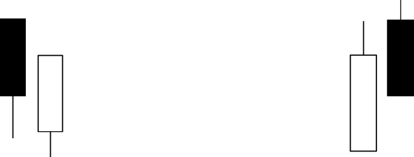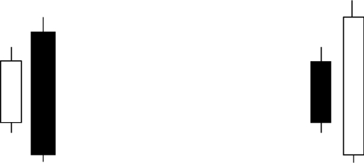②阴包阳和阳包阴(见图10.10)。阴包阳是第一根阳线的实体较长,但第二根阴线的实体更长,第二根阴线把第一根阳线完全覆盖,阴包阳显示多方的进攻在空方的反击下土崩瓦解,后市看跌。阳包阴情况完全相反。