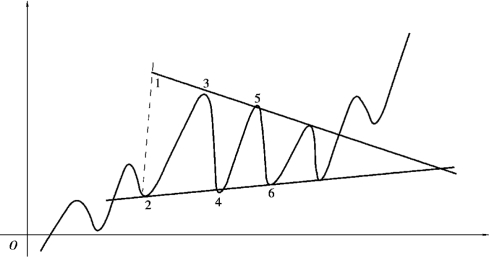图10.19是对称三角形的一个简化图形,这里的原有趋势是上升,三角形态完成以后是突破向上。对称三角形有两条聚拢的直线,上面的向下倾斜,起压力作用;下面的向上倾斜,起支撑作用。两条直线的交点称为顶点。