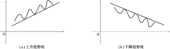 趋势线是衡量价格趋势的,由趋势线的方向可以明确地看出股价的运行趋势。在上升趋势中,将两个低点连成一条直线,就得到上升趋势线;在下降趋势中,将两个高点连成一条直线,就得到下降趋势线(见图10.14)。