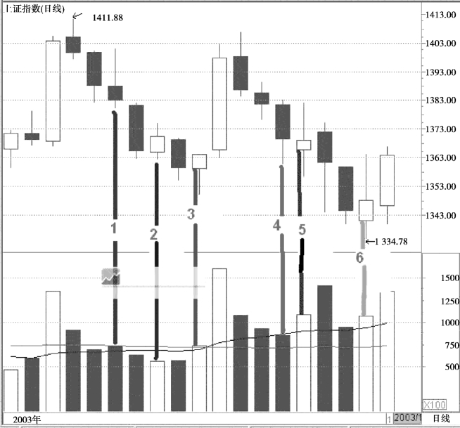来对比一下“1”处和“4”处的阴线和成交量,看起来好像是一个样,一根大阳线之后三根阴线,但认真比较就会发现它们的差别:“1”处的阴线放量,并且上影线较长,表示空方的力度在继续增强;而“4”处的阴线缩量,有较长的下影线,说明空方的力量有所减弱,因此第二天出现不同的走势也就理所当然了。再来对比一下“2”处和“3”处的阳线:“2”处的阳线出现上影,并且成交量萎缩,说明多方反扑的力度不强;而“3”处的阳线下影线较长,并且成交量有所放大,在这一回合的交锋中多方明显占优,所以它们第二天的走势也不一样。看看“5”和“6”处阳线,同样都是上影线较长的阳线,成交量也较前日有所放大,但它们第二天的走势却完全不一样,好像有些不可理解,但仔细观察就会发现它们的不同之处:“5”处的阳线仅仅把前一日阴线的下影线吃掉,明显对其构不成威胁(就好像跟别人打架一样,别人只用了一只胳膊就让你打了半天);而“6”处的阳线几乎吃掉了前日阴线的1/3,对空方的挑战就明显强于“5”处。因此它们第二天走势不同也就不足为奇了!